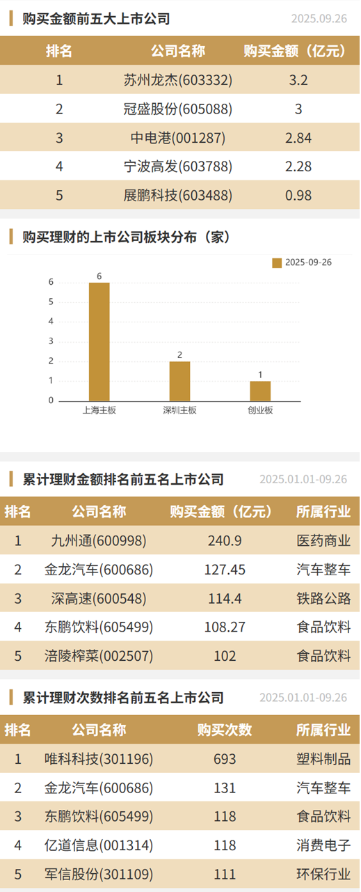 2025年9月26日,上市公司购买理财金额13.70亿元,共9家上市公司,理财产品31个。