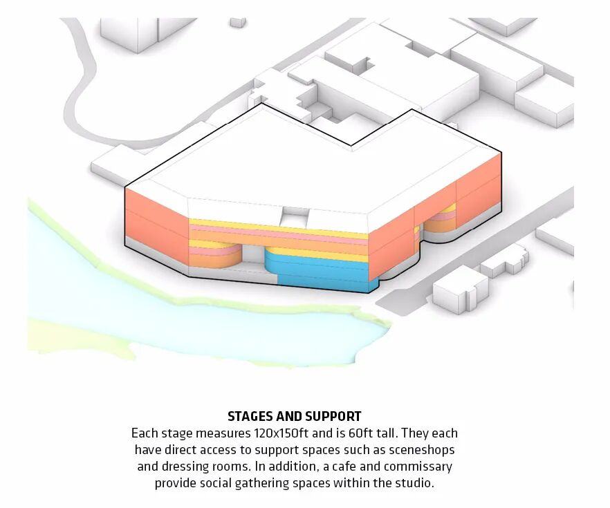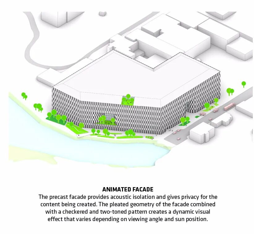 With a mission to create a "futuristic world-class content creation campus in Queens" and answer to the constant demand of large production studios in New York City, the seven-storey film, television, and creative studio complex explores streaming, AR, VR, and gaming, alongside traditional production environments. To ensure creative and dynamic workspaces that foster collaboration and connection, the interior was designed with strategically-planned interconnected spaces of both private and public functions. The structure includes 11 sound stages, 310 off-street parking spaces, and a waterfront esplanade that is open to the public. Alongside the range of stages, the project also includes production-support areas, public and private offices, fitness room, cafes, and lounges.