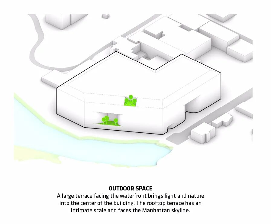 On the exterior, the building will be clad with angular precast concrete panels that create an animated effect following the sun's movement through the day. Two open-air terraces are pierced into the façade, providing an outdoor connection to the waterfront and views of the Manhattan skyline, and the building’s roof will include a 150,000 square foot solar panel footprint.