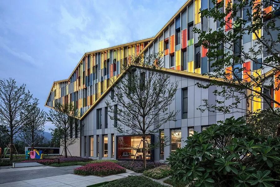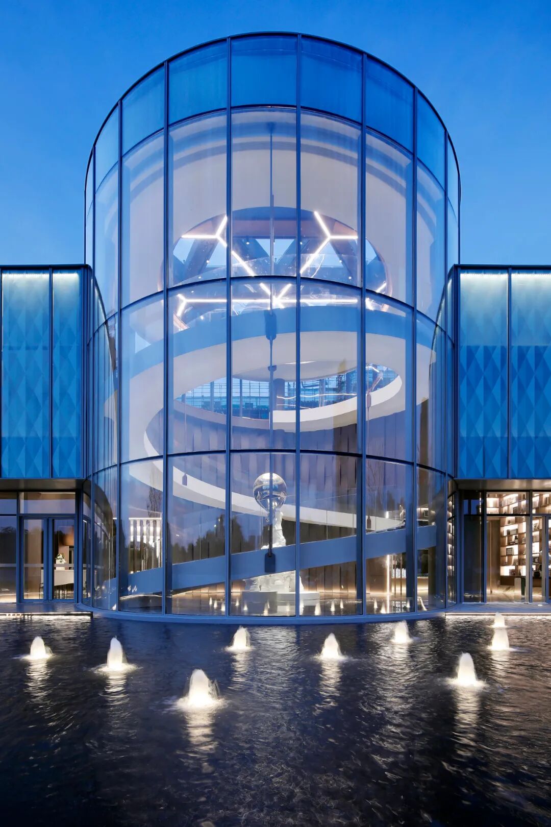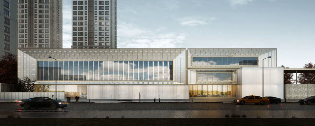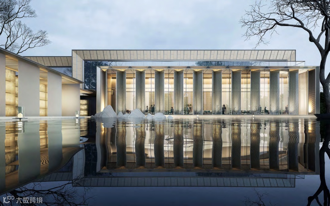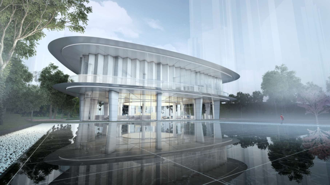 立面的弧形铝板,月牙形穿孔板及建筑尾部的3级退台造型,结合镜面水景,环境和阳光被温柔的反射进来,创造出一种连续、透明的感觉。