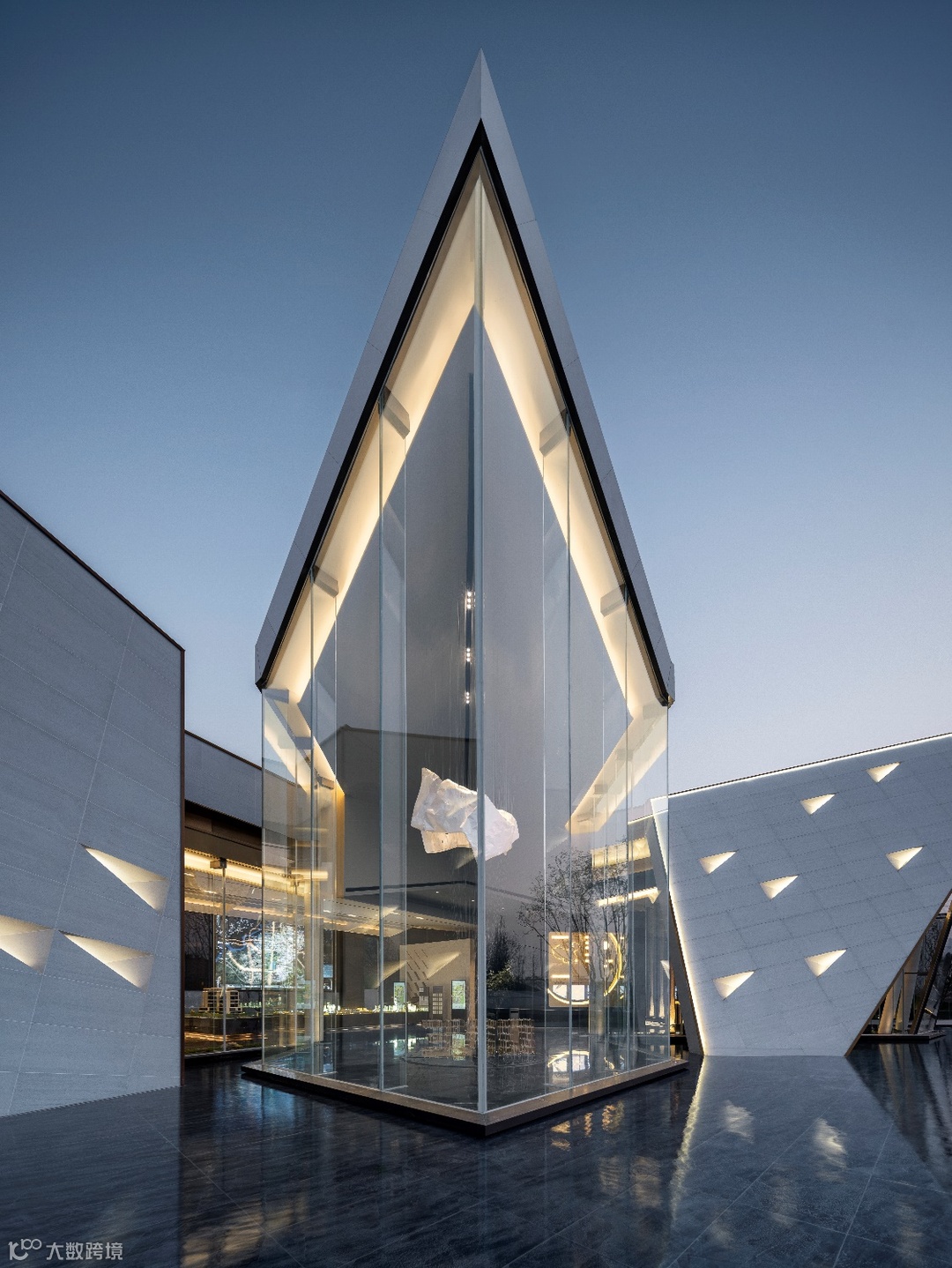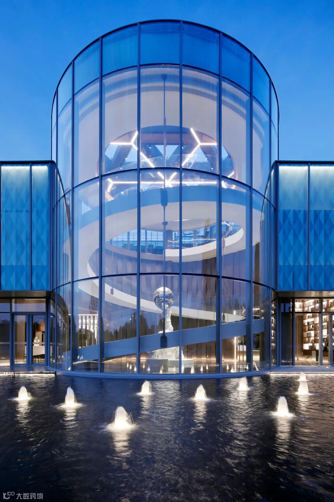 杭州保利潮起云上府售楼处为方形与圆柱相互穿插咬合的玻璃体;圆柱体内部通过曲线楼梯螺旋上升,通达顶层;在螺旋中部则形成一个相对开敞的空间,与上空玻璃顶上下辉映。