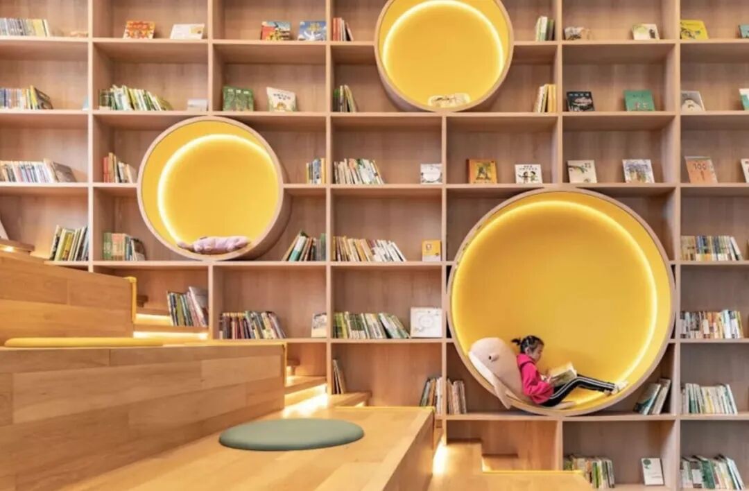 中投里城在漳州开发的某度假住宅项目,在营销中心里直接打造了一个大型阶梯图书馆,提供海量书籍。大人们忙碌的时候,孩子可以陷在书架上的圆形空间中专注阅读。