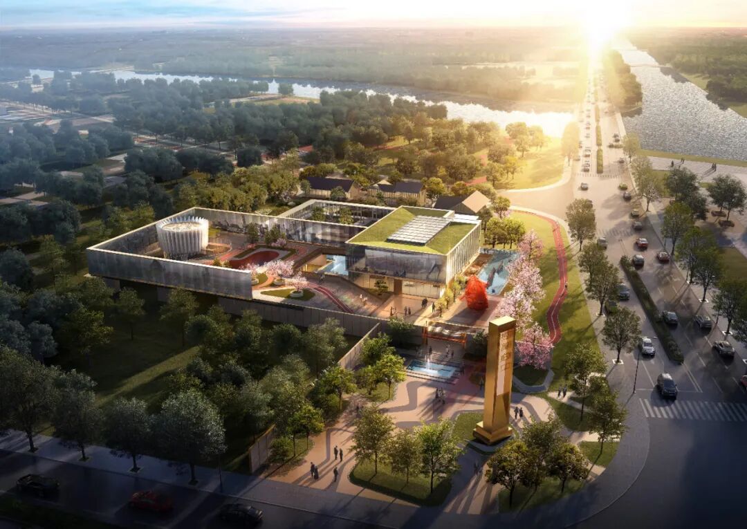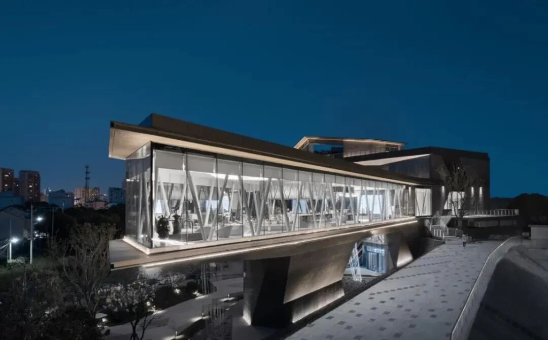 建筑的两端起翘,仿佛白鹭展翅,整个建筑虚实交替,形态现代简约、舒展大气。不自觉让人悠然神往起“风定江澄境象间,水清波影倒云山。渔舟荡漾清光裹,白鹭惊飞杳霭间。”的闲适生活。