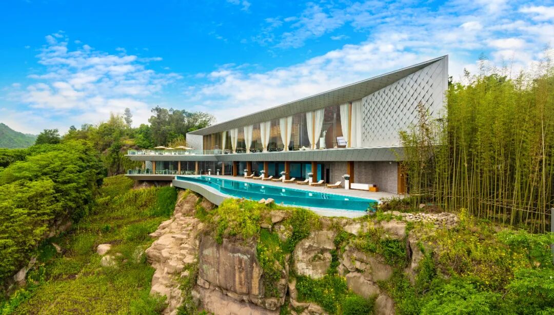建筑师选择将建筑置于高处的岩体之上,极具戏剧性的断崖式高差,巧妙的选择角度后,更大化利用景观资源,一望无际的视距,建筑犹如张开双翅的仙鹤傲立于仙岩之上。