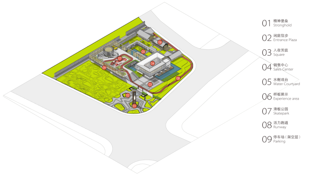 城市会客厅流线,周边设置城市公园、活力跑道、滑板公园等,能够激活片区的活力。