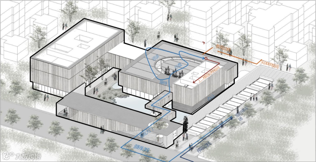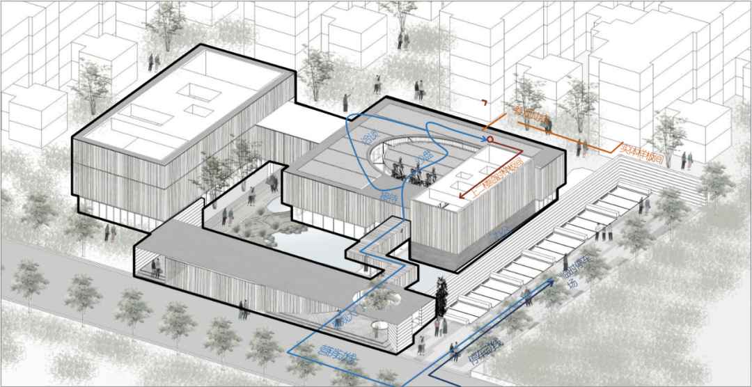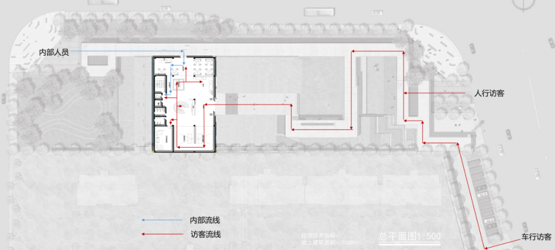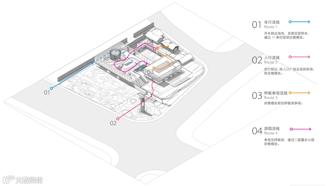 考虑车行到达流线,人行到达流线,结合场地错落的高差,实现全面展示效果。