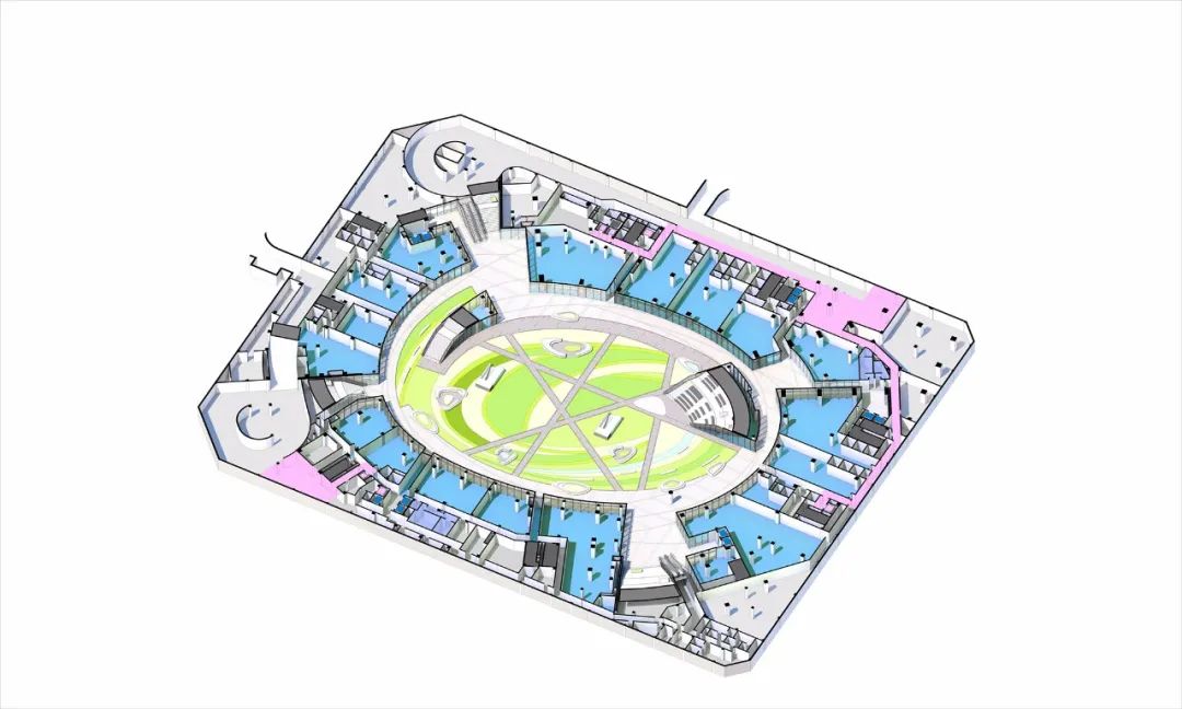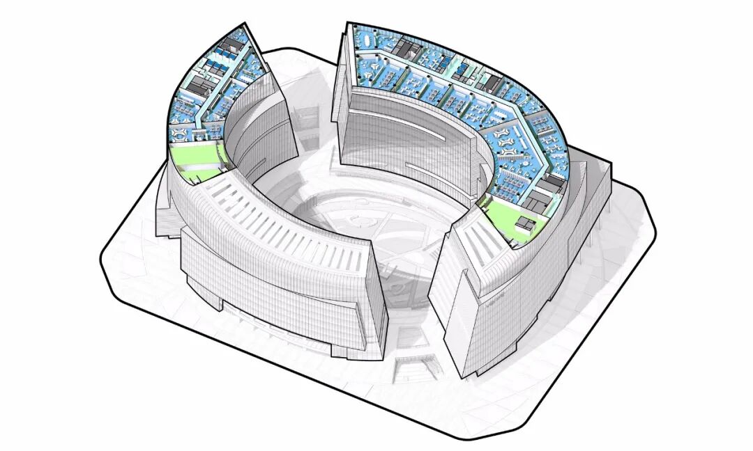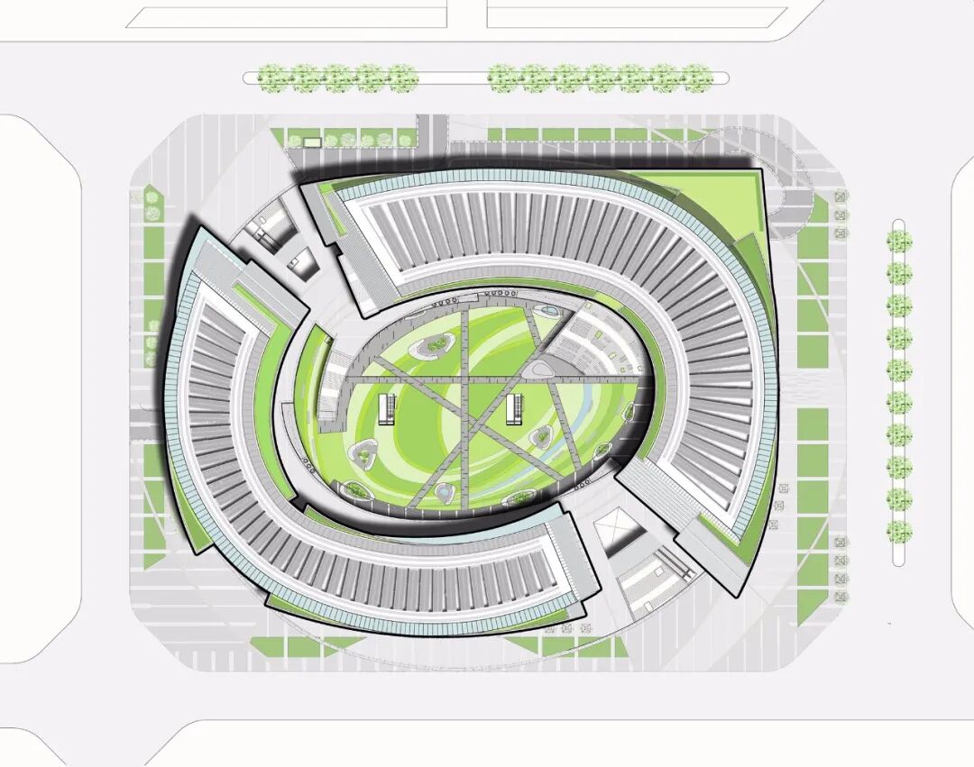 项目采用两段圆弧体量的围合柔和与丰富了周边生硬单一的街道空间形态,为自身以及周边项目提供了明亮宽敞且多样化的视线通廊,同时也创造出对角的入口广场空间、生动有趣的内部庭院空间和连接所有公共开放空间的流动路径。