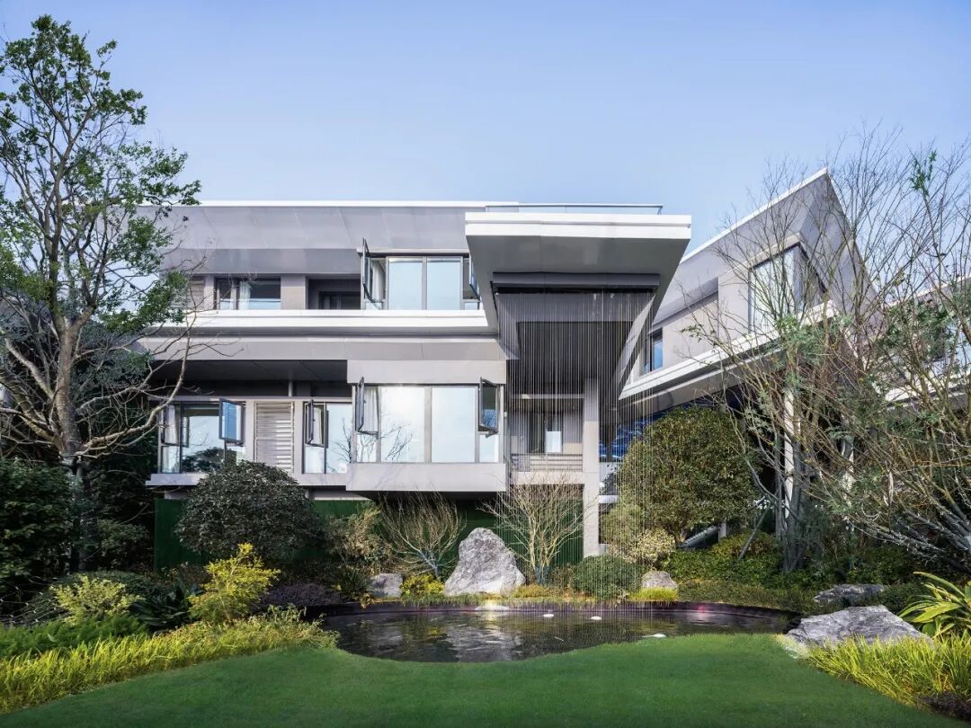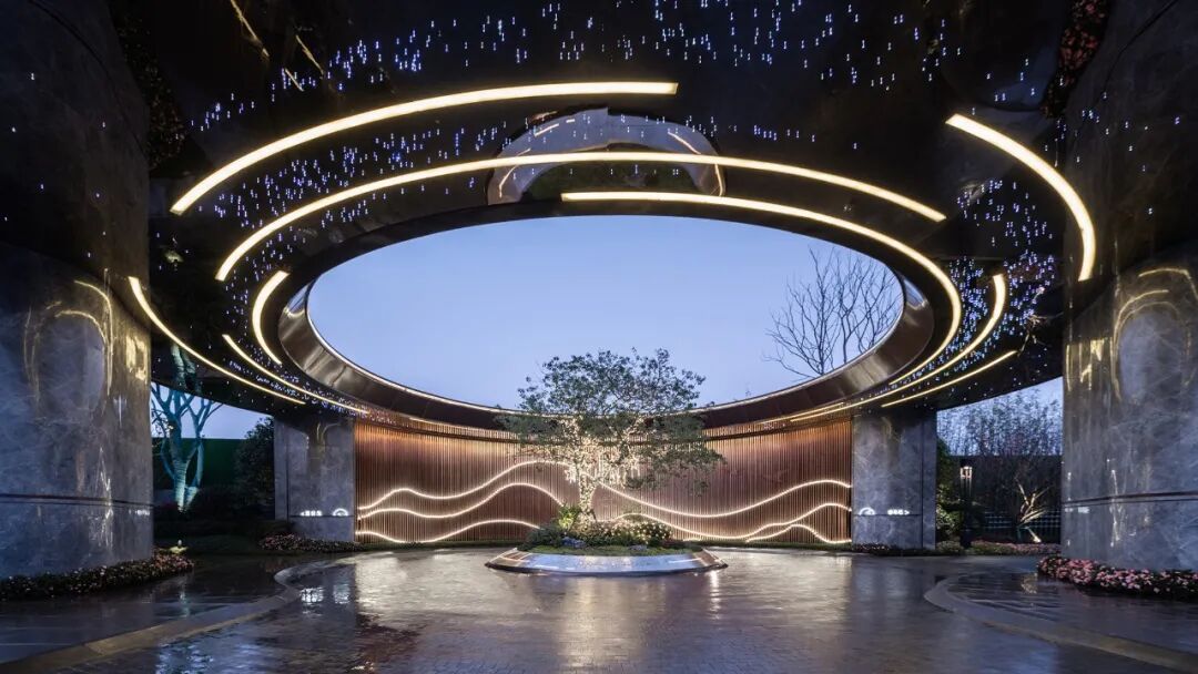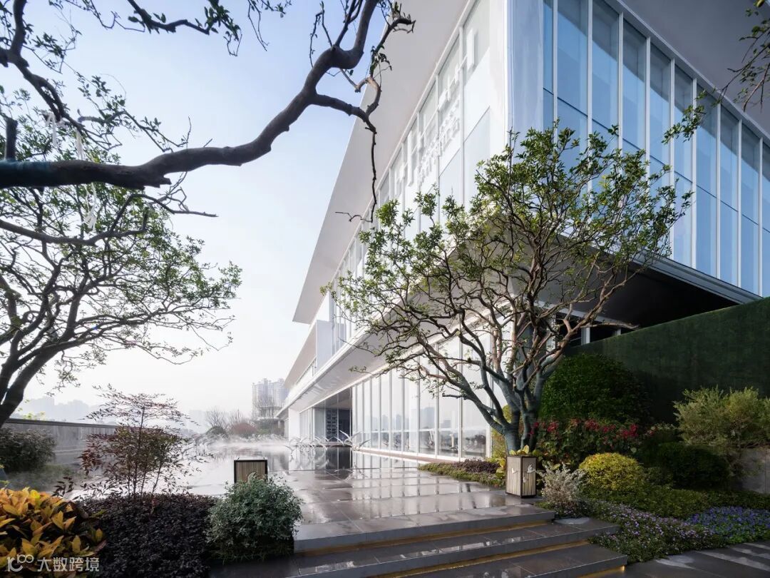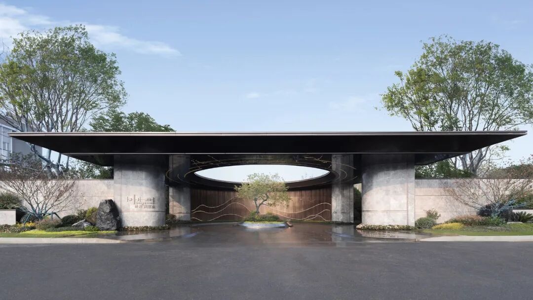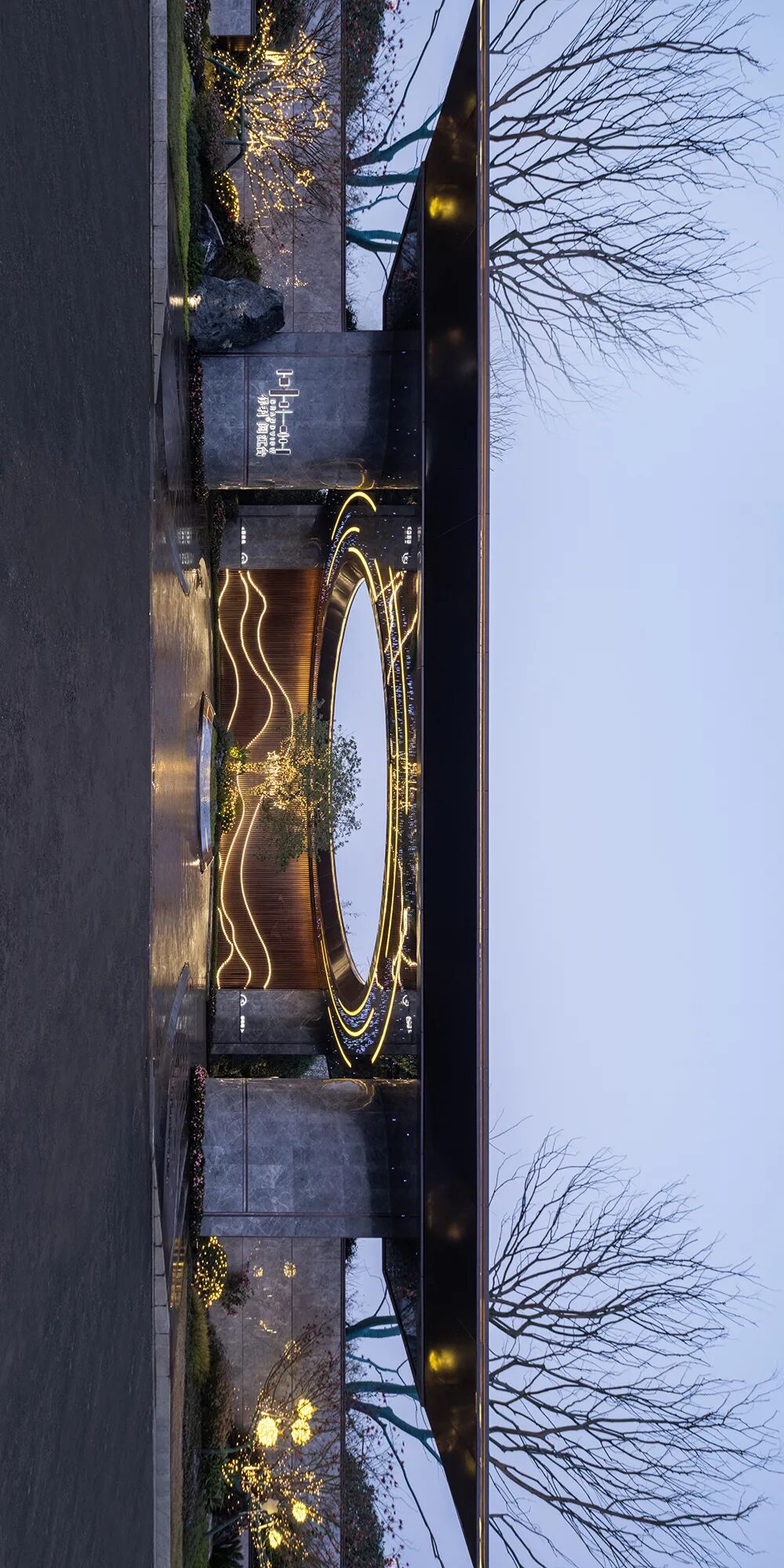 高大的精神堡垒形象,高大俊逸的外形与质感成为示范区的第一重映像。售楼部的外界面延展而开阔,山石的质朴与石材的精致质感碰撞倍显精致。叠石上,丝丝流水的律动为空间带来活力,共同打造山水意境的形象展示入口界面。