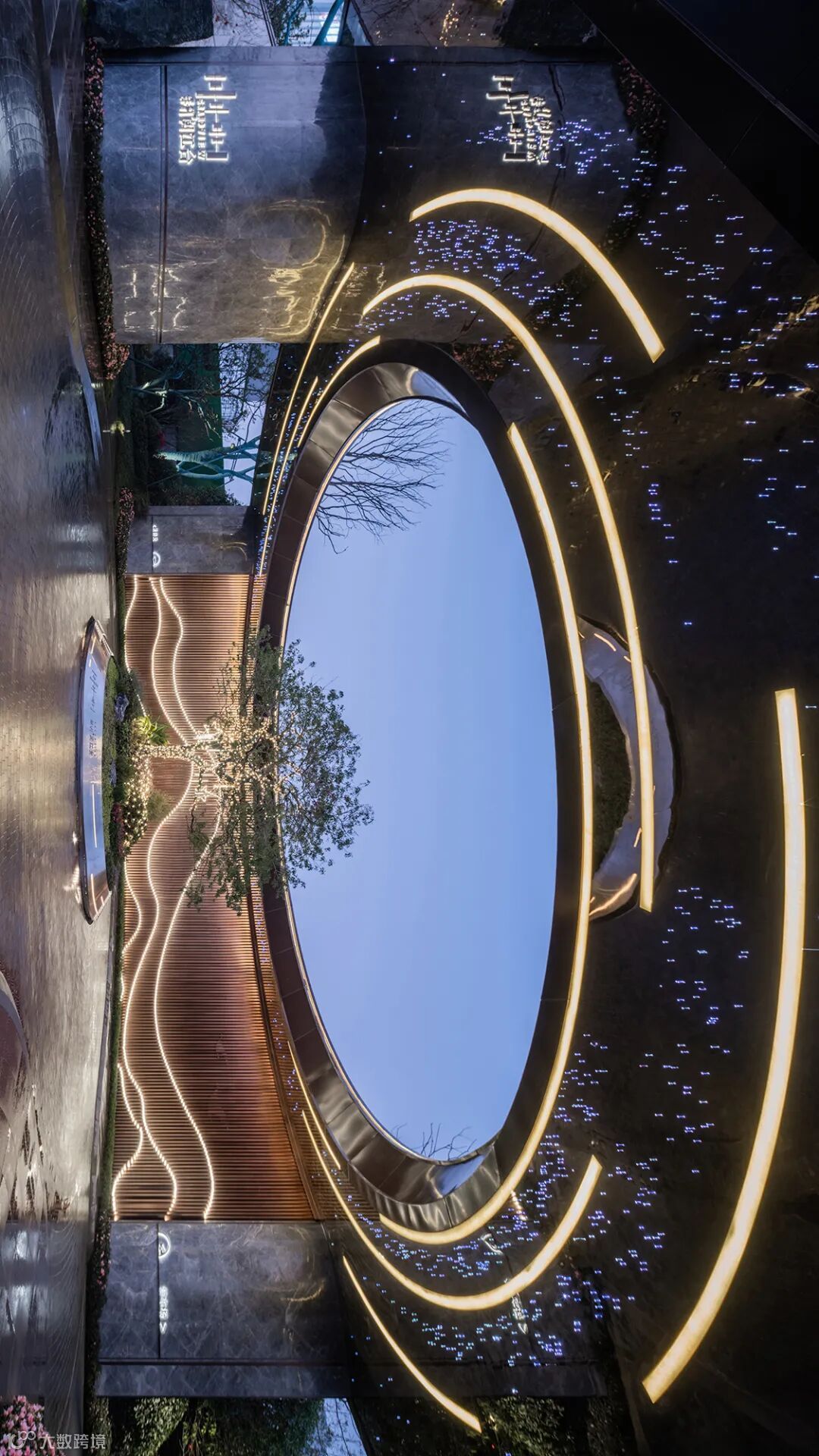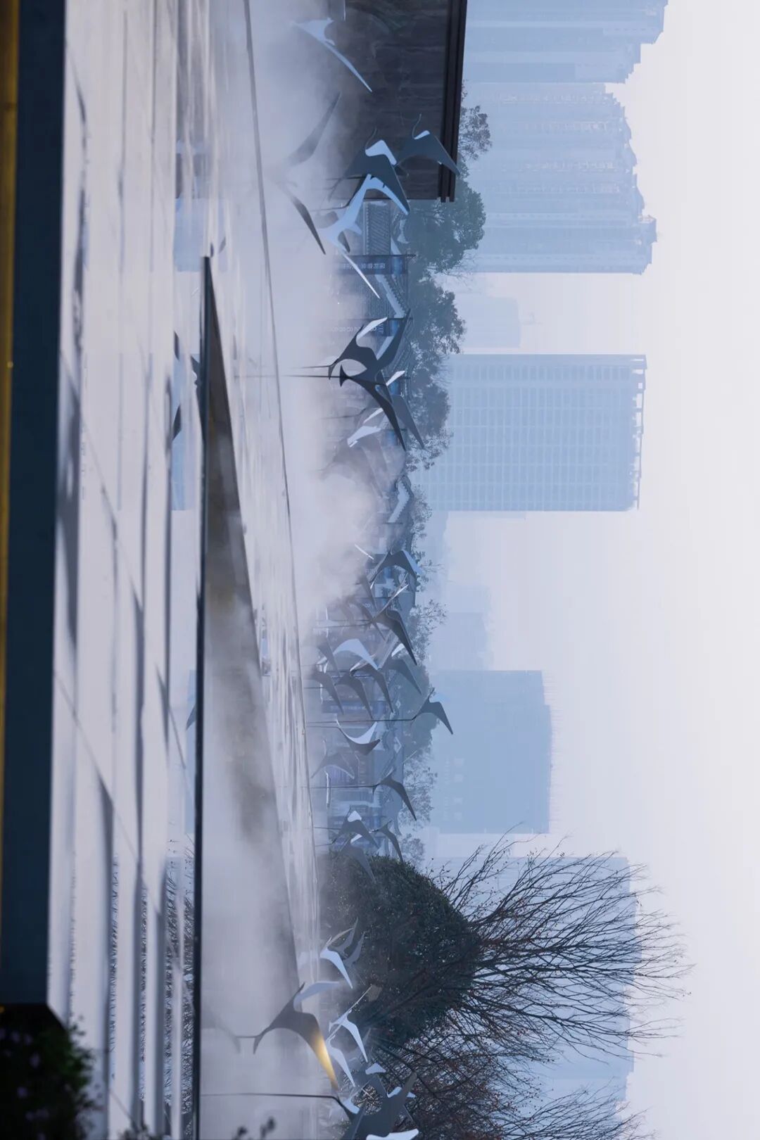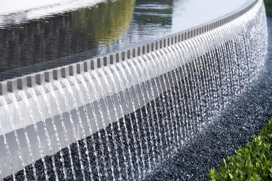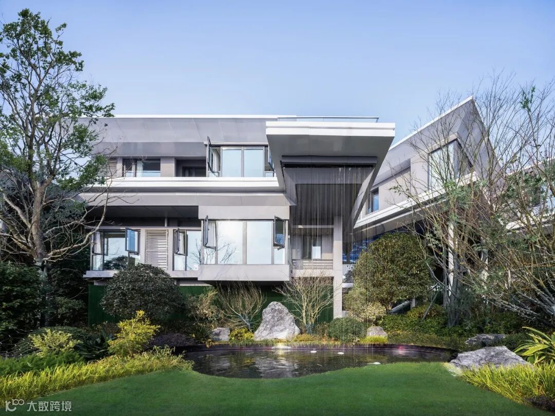 高大的精神堡垒形象,高大俊逸的外形与质感成为示范区的第一重映像。售楼部的外界面延展而开阔,山石的质朴与石材的精致质感碰撞倍显精致。叠石上,丝丝流水的律动为空间带来活力,共同打造山水意境的形象展示入口界面。