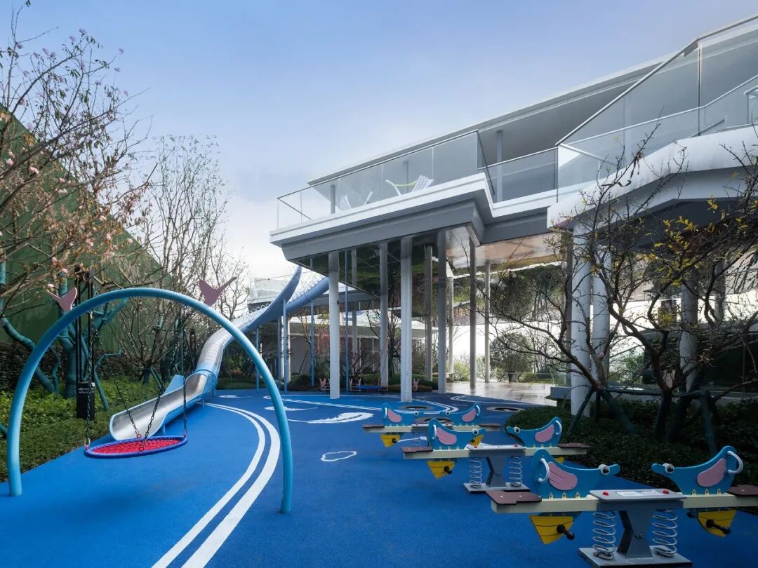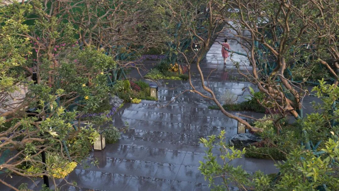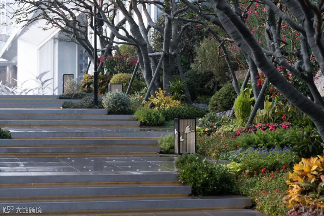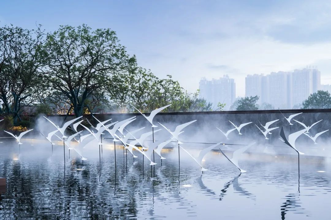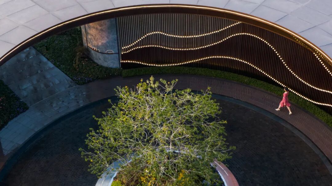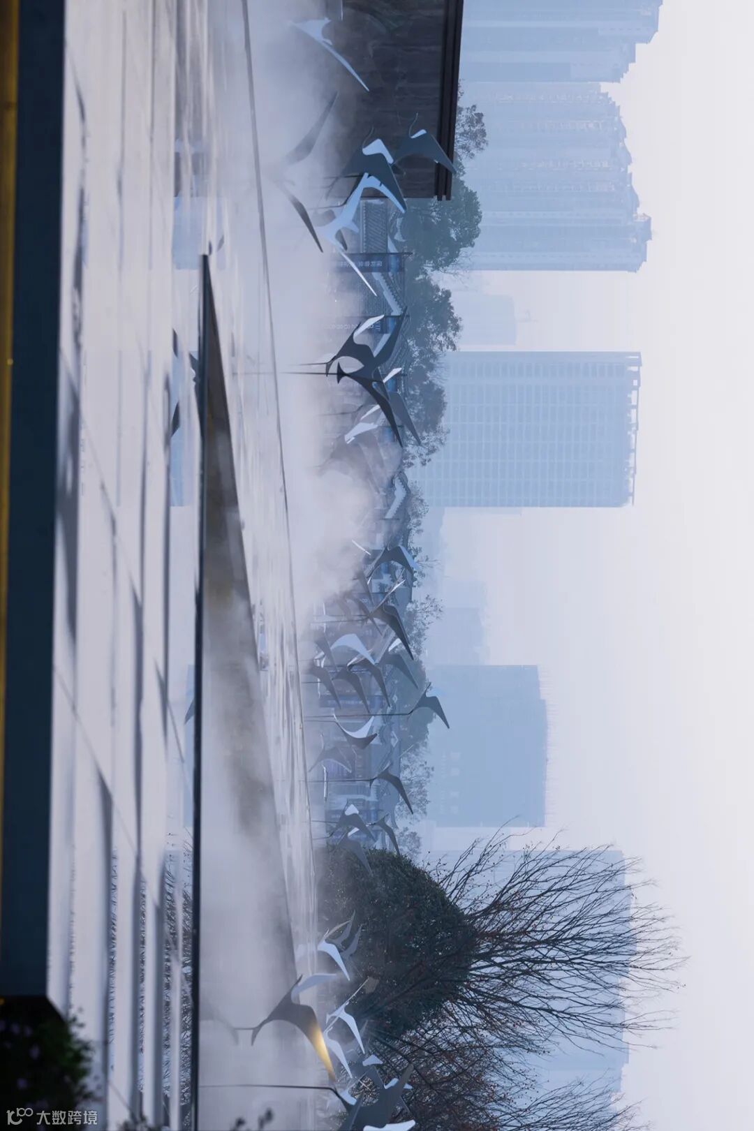 高大的精神堡垒形象,高大俊逸的外形与质感成为示范区的第一重映像。售楼部的外界面延展而开阔,山石的质朴与石材的精致质感碰撞倍显精致。叠石上,丝丝流水的律动为空间带来活力,共同打造山水意境的形象展示入口界面。