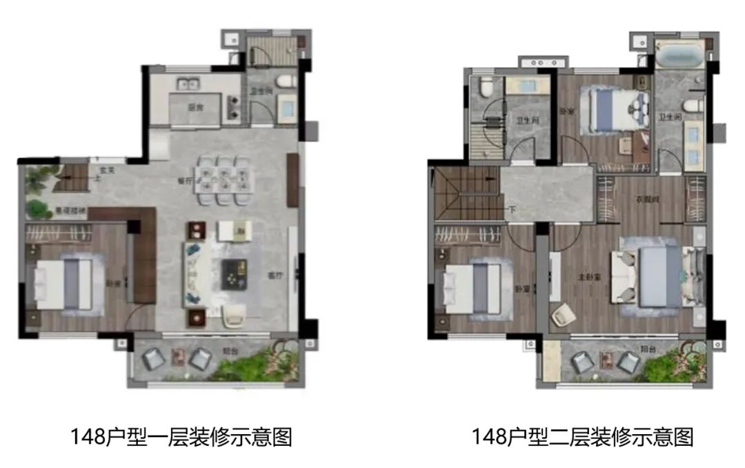 148平方米户型方正,动静分区,全南北通透,南向超8.5米的超大面宽,解决了复式楼最为传统的房间面宽小、居住舒适度差、餐厅位置光线昏暗问题。148户型还拥有上下层独立的阳台,享受别墅般的居住体验。
