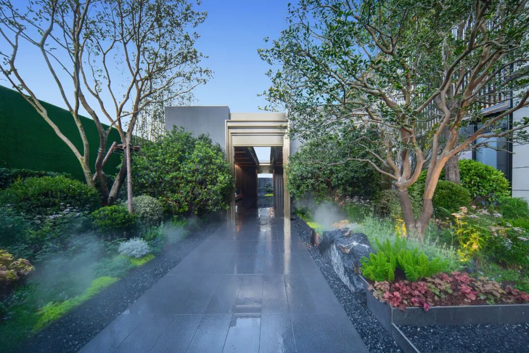 规划设计超大中央花园形态规整,花园进深46米,构成近2000平方米的空间组团。中央花园与两侧组团景观连通,通透开阔构成舒适愉悦的空间体验。景观空间引入场地文化优势“西湖八景”,打造酒店格调,置于宅院之中,破除酒店与宅院的界限,相互融合,感知艺术人文传达,为都会名流打造一方隐匿于闹市的精奢国度,打造福州首个现代美学与传统文化融合的酒店式宅院。
