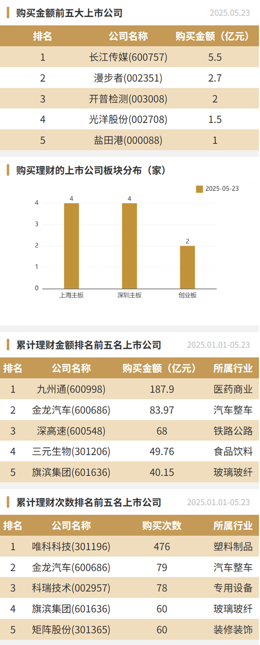 2025年5月23日,上市公司购买理财金额14.32亿元,共10家上市公司,理财产品28个。