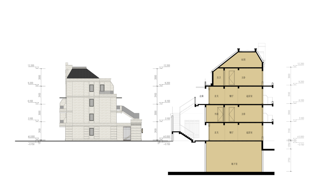 建筑材质甄选黄麻石材、白麻石材作为基座和区分层级关系的主要用途,其他部分采用与石材质感较为接近的黄麻和白麻真石漆,有的放矢的将多样化的材料进行合理布局运用。