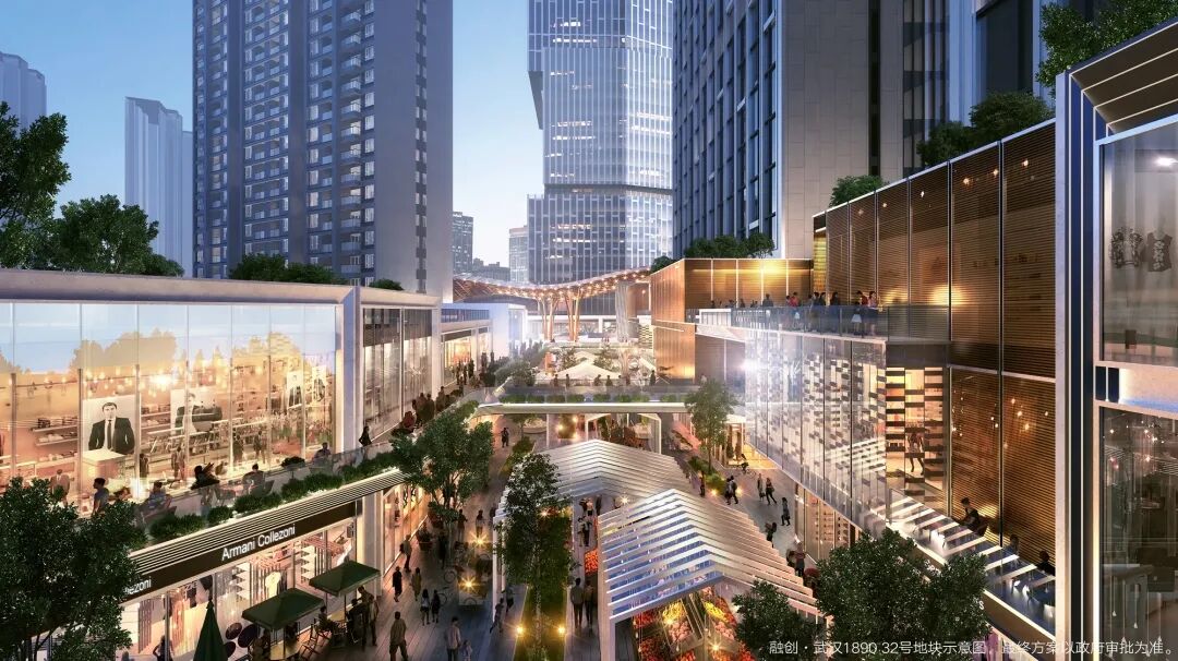 35%的精品低密商业街区保证了商业街区的休闲品质,并在其中融入了荆楚建筑风骨,实现了“街与巷的相逢”,尺度亲人、结构适宜,增强了街区的市井感,让人的活动与交流成为了“充满市井气息的亲切日常”。