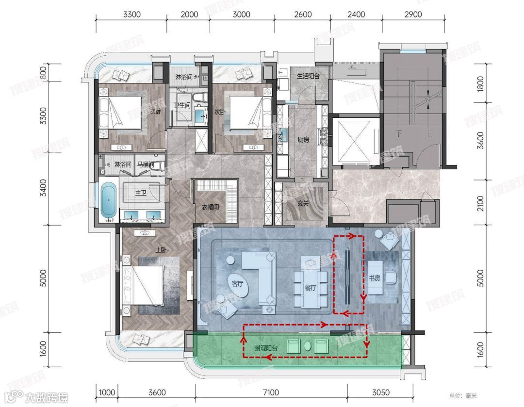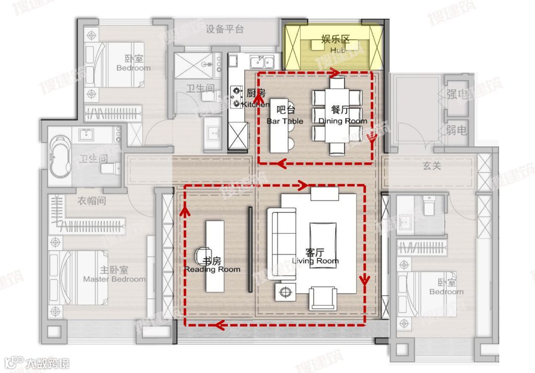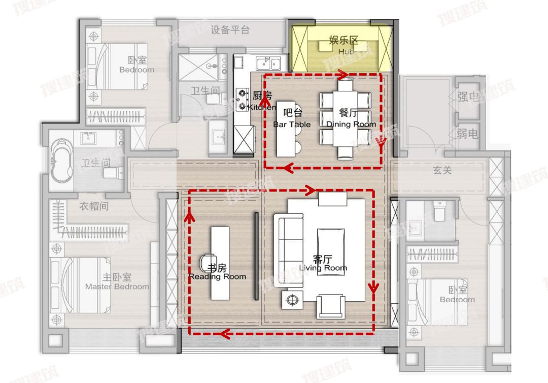 主人动线:主人归来,从玄关步入艺术走廊,直接进主人套房,换上家居服,即可享受舒适的个人时光。