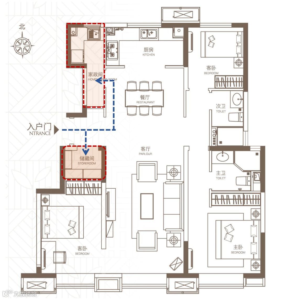 万科西庐125平米户型进门后,沿左侧便是家政动线,家政间位于厨房一旁,超级方便。入户右手边还有个储藏室,可以堆放购物车、大件玩具、日用品囤货等等,非常实用。