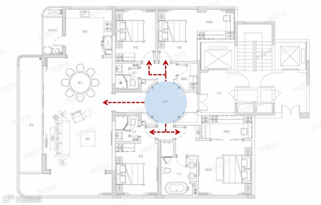比如在锦江天玺建面约202㎡户型中,一大亮点则是圆形玄关,四间卧室围绕玄关均匀排布,保证了每个卧室的私密性。