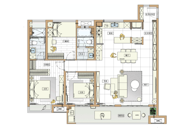 公区是经典LDKB一体化生活轴线,社交空间、会客空间、烹调空间连成一体。超10米面宽的大边厅连接L型跑道阳台,中岛台,担纲社交厨房重任。