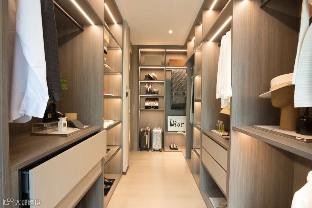 双玄关收纳体系,玄关收纳以及入户步入式衣帽间设计,紧邻电梯厅和北侧走廊,特殊时期取放防疫物资、消杀,十分便捷。平时出差、下班,风尘仆仆地回到家,也可以在外面换洗完再进入客厅,晾挂衣服,完全做到了洁污分区。