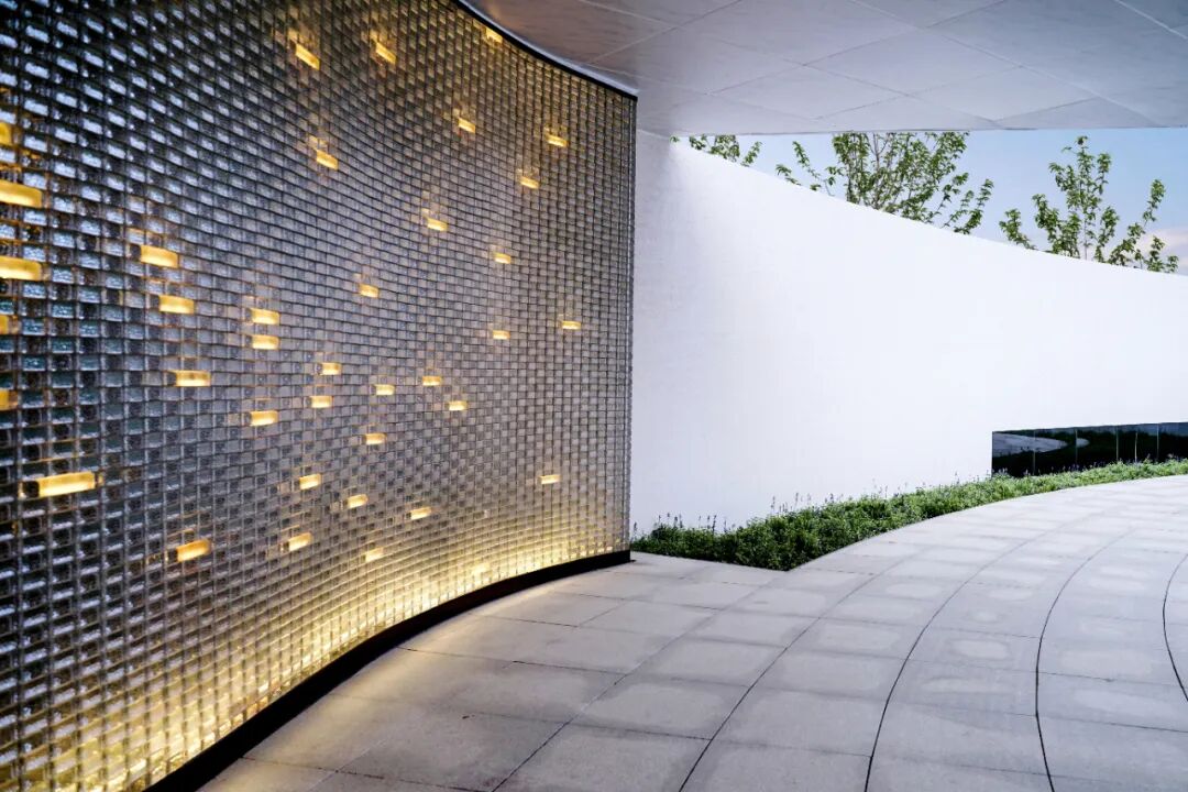在有限的场地中如何将空间体验放大,设计将建筑景观室内的边界进行弱化。建筑的幕墙和景观围合有机融合,同时景观的景墙延伸至室内,将观者视线继续向内延伸,统一打造一体化的空间情绪递进。
