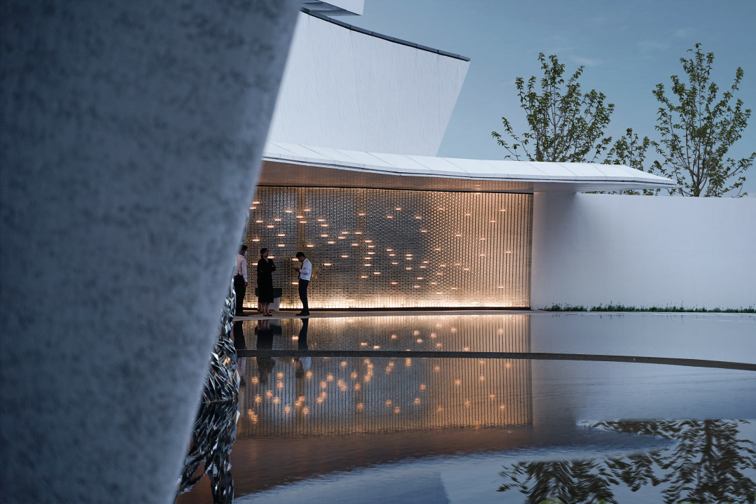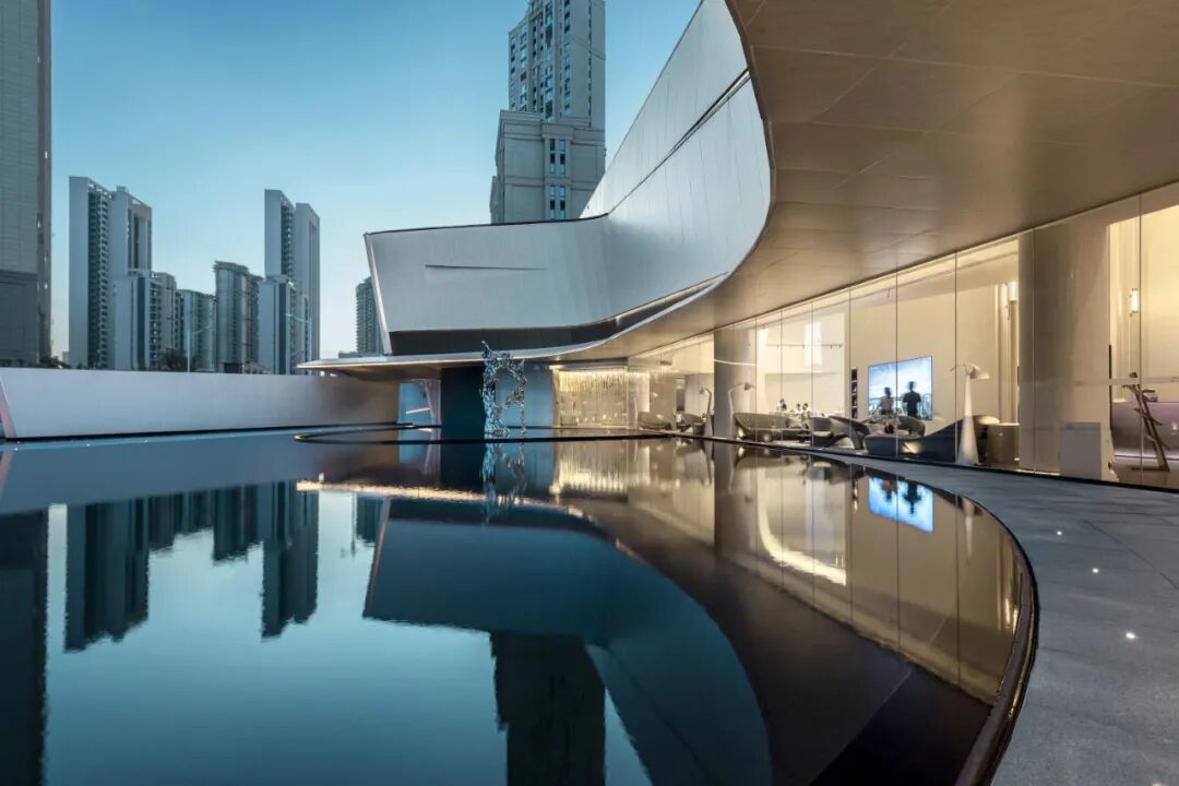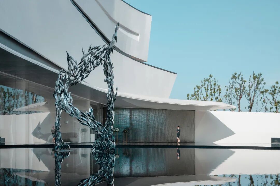 毗邻青山湖,引水入画,伴水而上,穿过入口廊道,一个具有“艺术视野”的静水面映入眼帘,人在行进过程中层层递进的视线聚焦于水面倒影,这种内部极致的秩序感,让尊贵的气质更加突出。