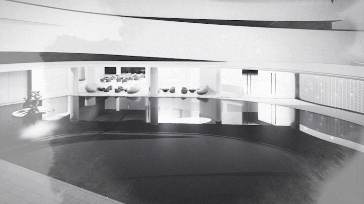 “一捺”流畅而不锋芒,含蓄内蕴,开合有序,限定出入口空间,使入口内敛低调,神秘而富有内容,继而向前,天圆地方,透过入口的“天圆”瞥见建筑一角,初见锋芒。