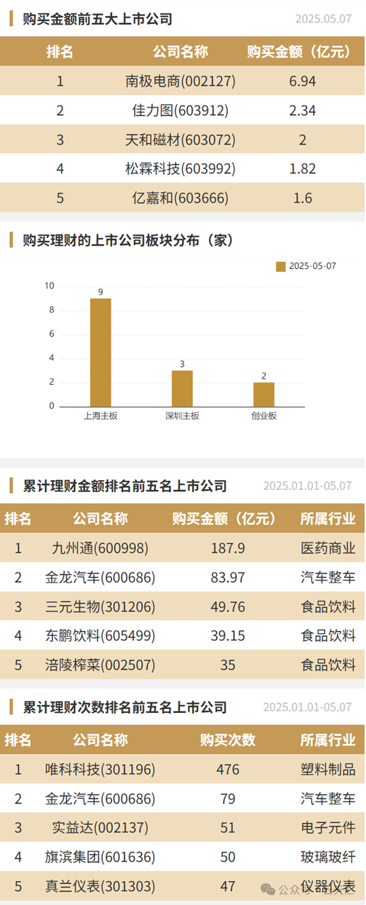 2025年5月7日,上市公司购买理财金额17.55亿元,共14家上市公司,理财产品28个。