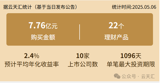 2025年5月6日,上市公司购买理财金额7.76亿元,共10家上市公司,理财产品22个。