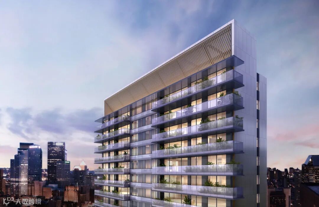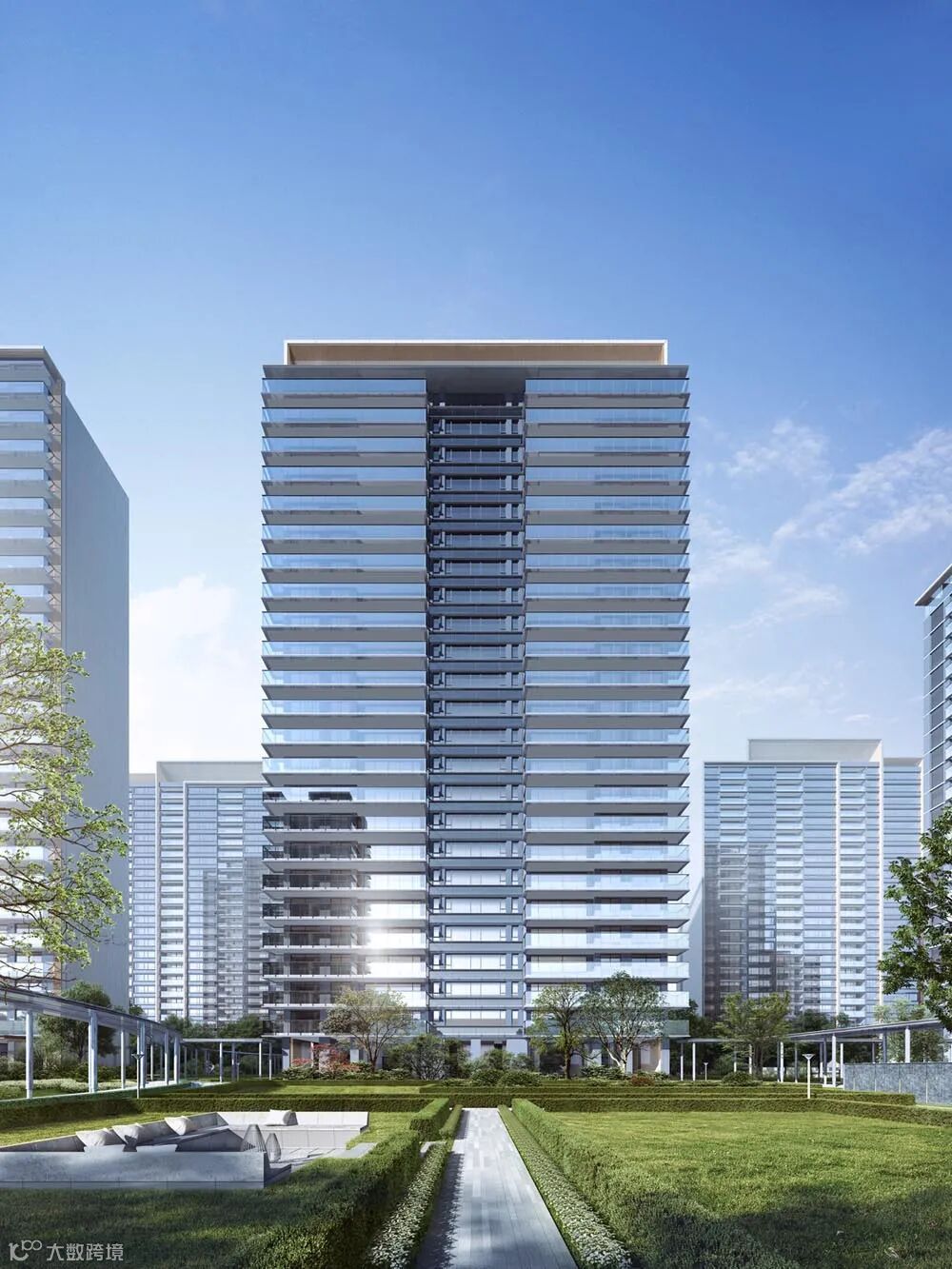 空中花园与阳台的结合,突破了常规项目对阳台比例的限制,让户外休闲空间在宽度和深度上得到极大拓展,两者组合而成的大面宽玻璃栏板向两侧出挑,形成花园和阳台悬挂于建筑主体之外的视觉观感,临空而立,呈现出轻盈、通透的立面效果。