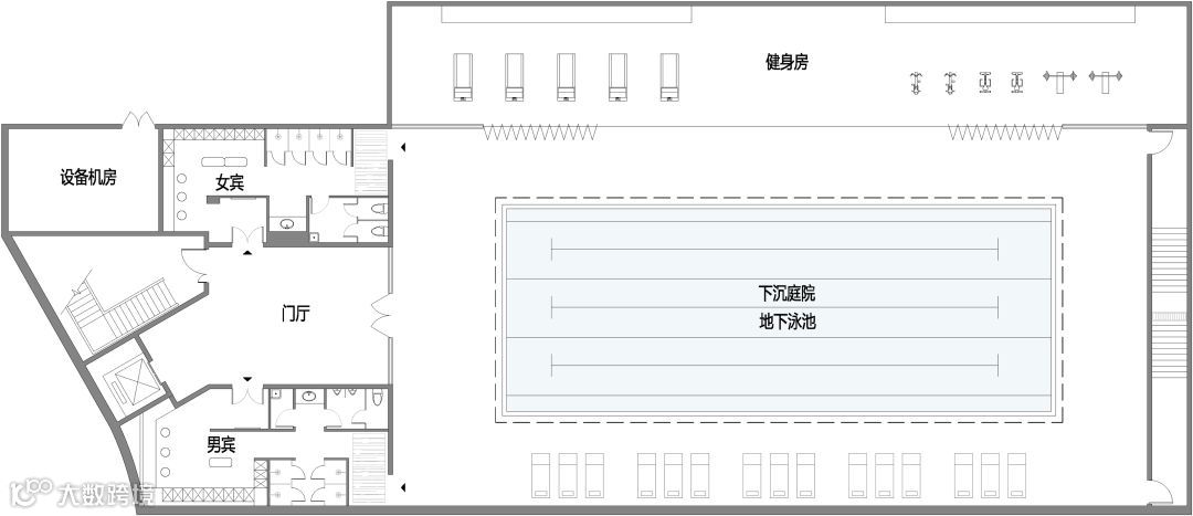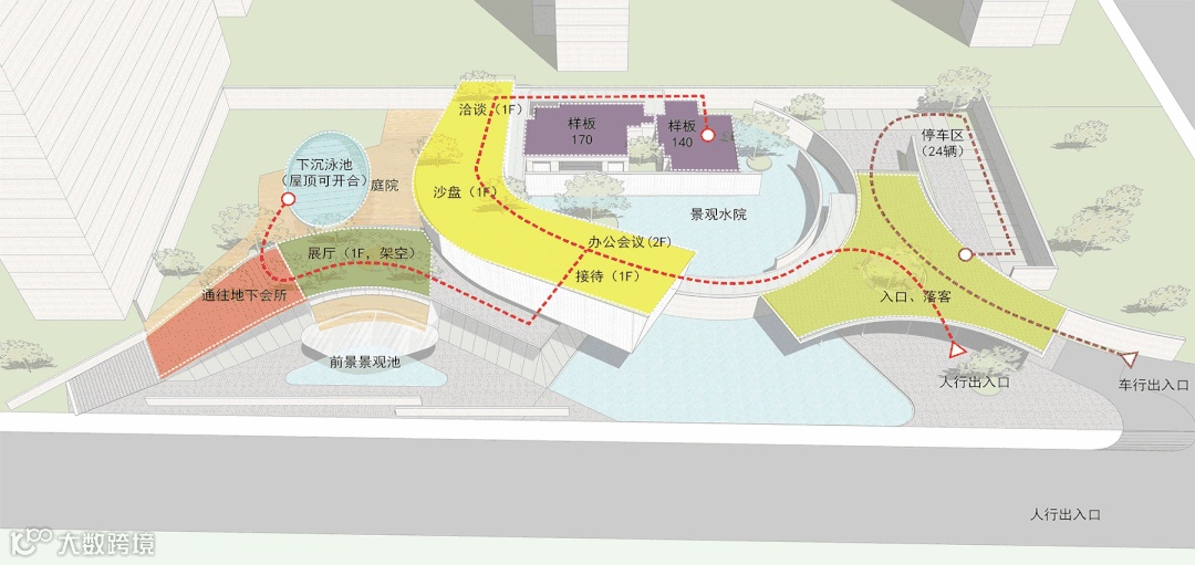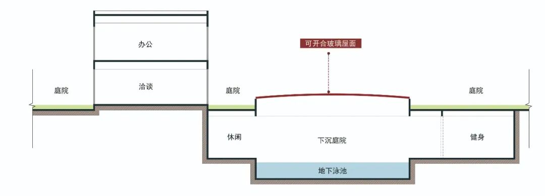 在住宅市场中,是否配置带恒温泳池的会所已成为检验豪宅的重要标准,而为了不损销售货值,设计通常将会所设置于地下,不计入容积率,但根据当地规定,地下空间的非车库的功能面积都需要按照地上土地价格补交土地出让金,设置地下会所所需的巨大成本让开发商望而却步,也让当地大多数豪宅遗憾地与高端会所失之交臂。看似无法调和的矛盾,line+通过另辟蹊径的设计,兼顾了经济效益与空间品质。