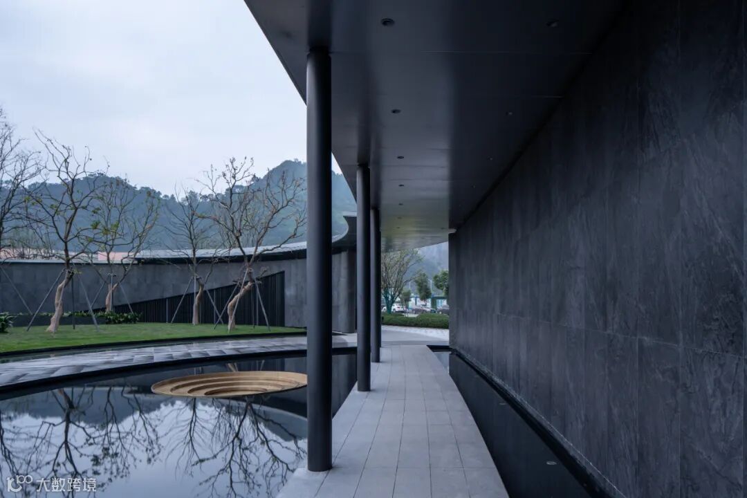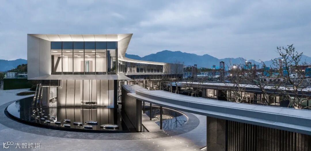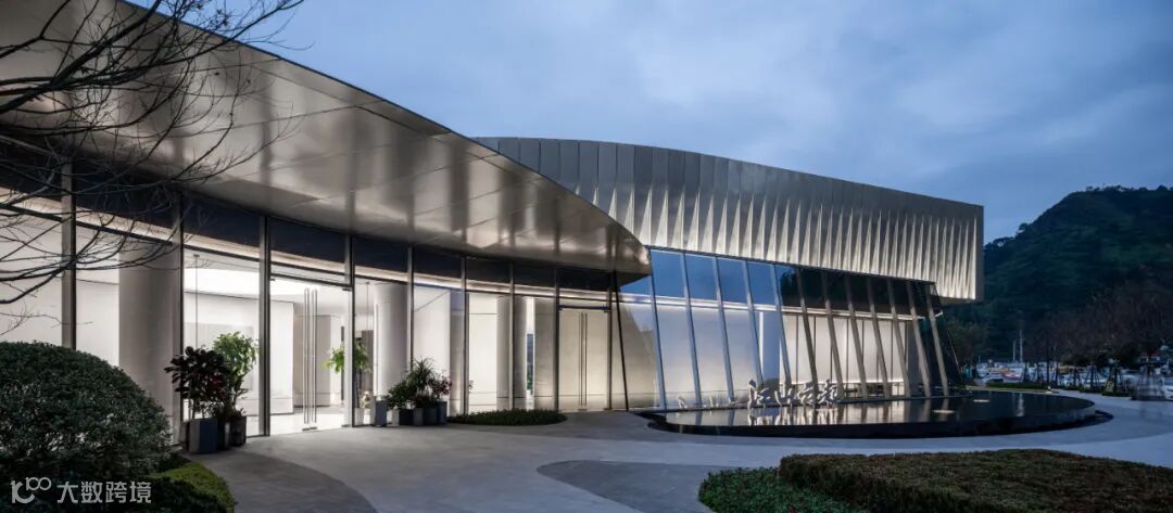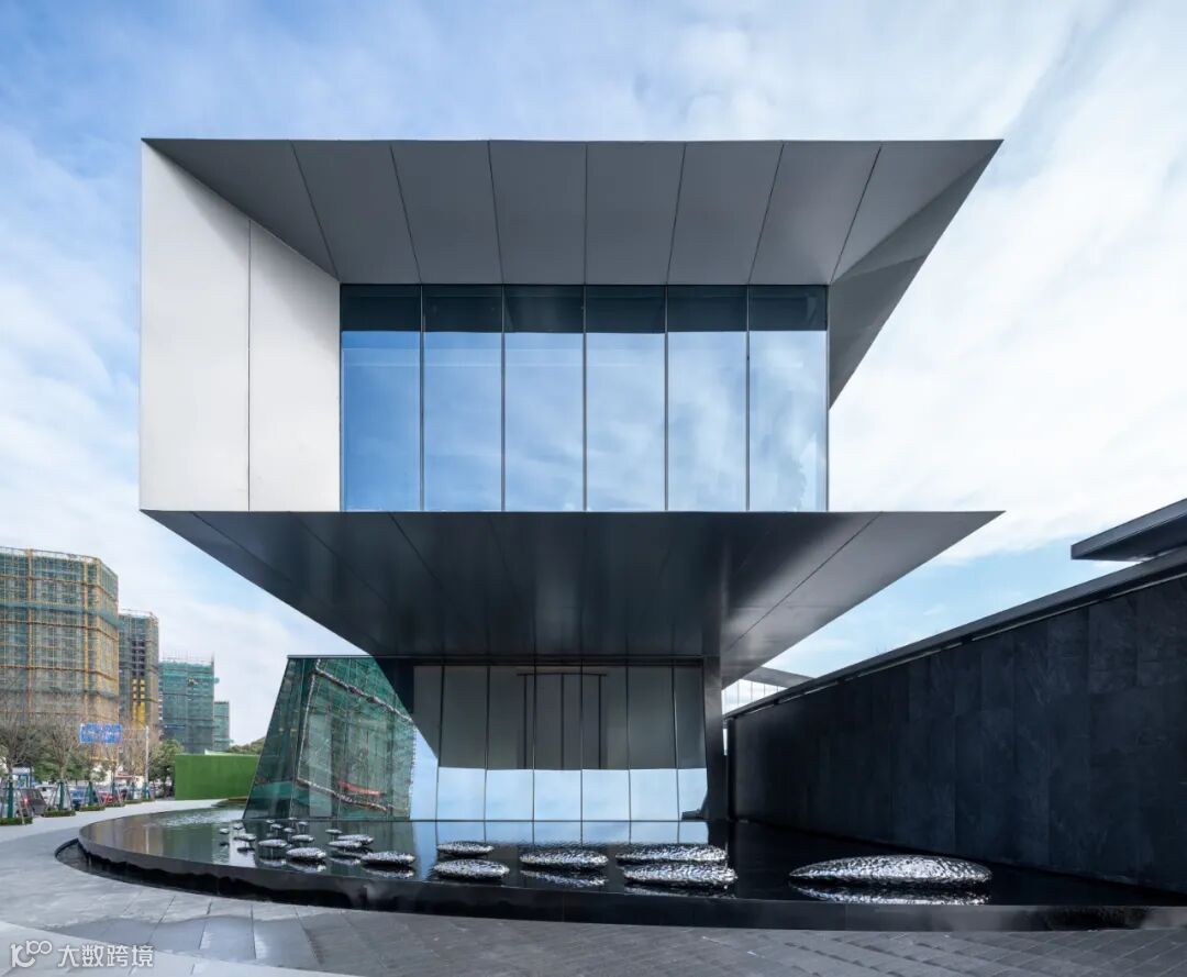 形体上由两条曲线上下搭接而成,一条曲线落地,形体微微向内倾斜,以大片玻璃面营造包容通透的空间,回应城市界面;一条曲线漂浮,朝着远处杨府山悬挑十米,以大面铝板包裹玻璃,轻盈舒展,飘向远方。