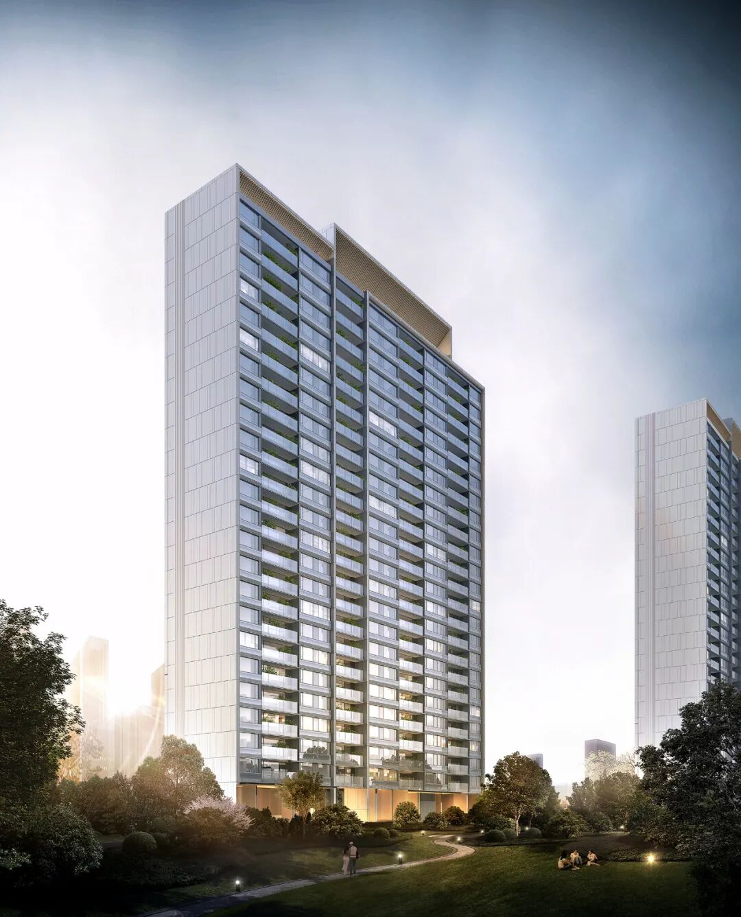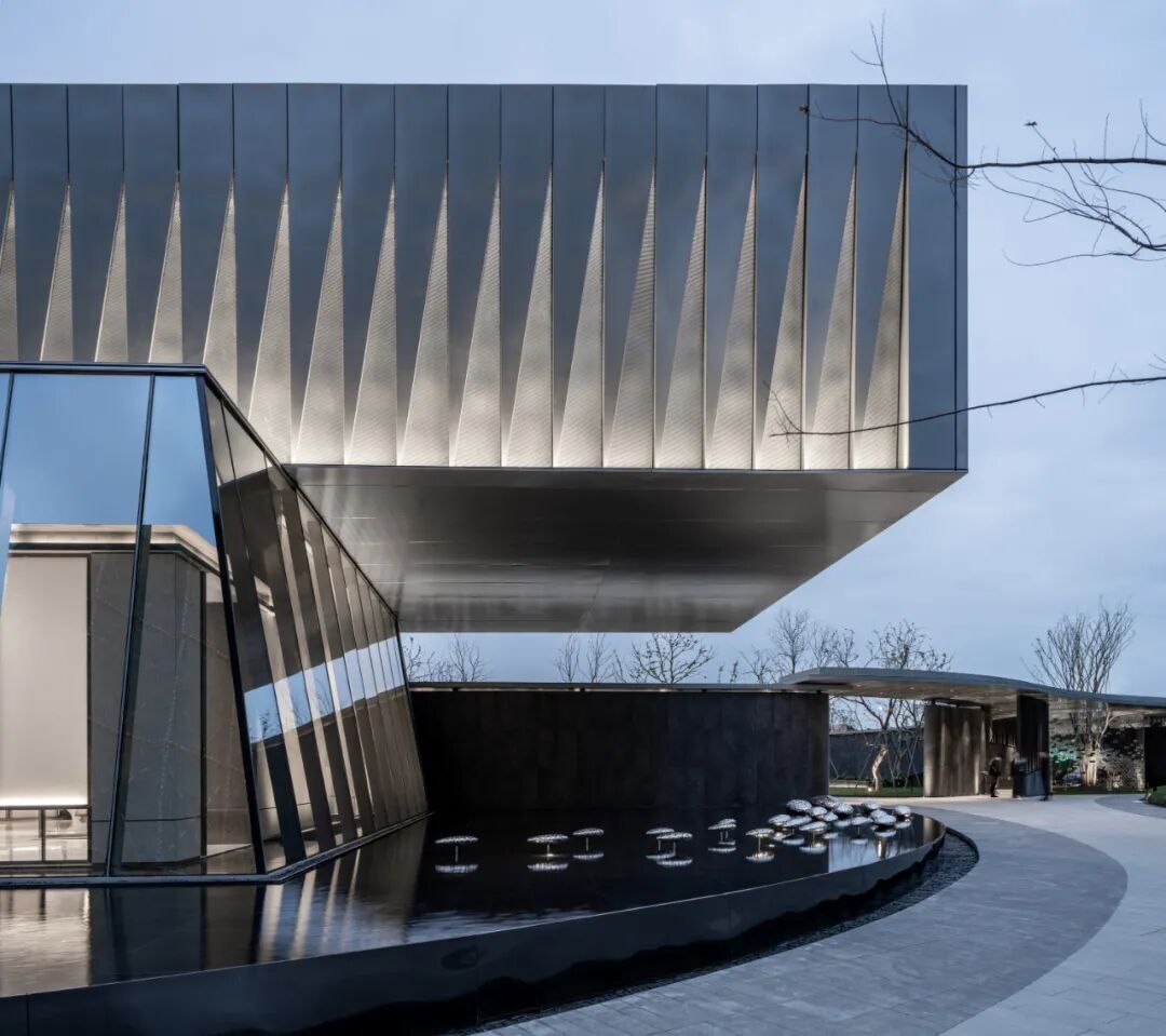 立面上采用大量冷灰系的玻璃和铝板,局部搭配香槟金色的铝板和线条,在沉稳高冷的建筑气质中增添一丝温暖,营造轻奢且温馨的建筑表情。