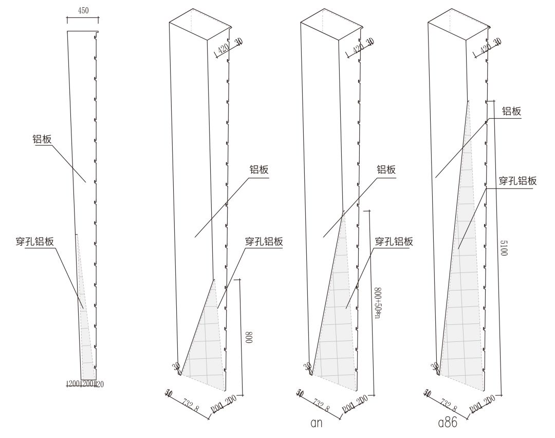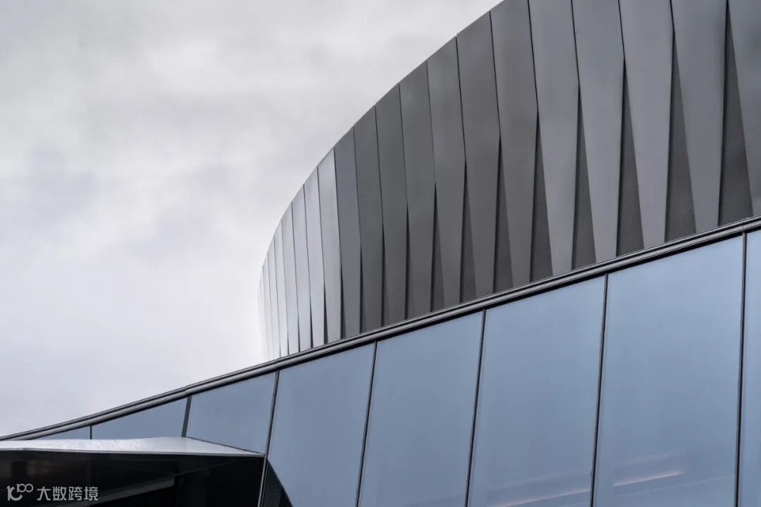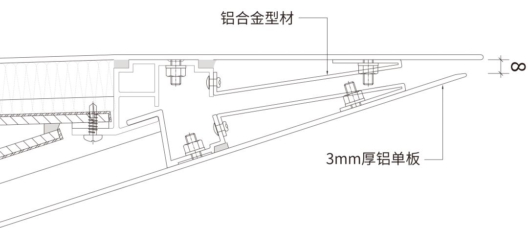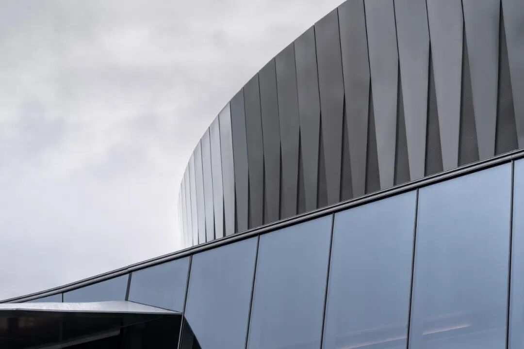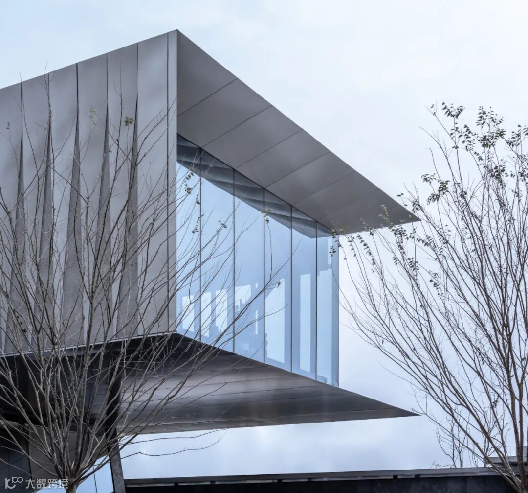 为了营造建筑纯粹、未来感的气质,设计采用极简的方式来处理构造和细节。在所有可见的铝板拼接表面,避免幕墙胶缝影响建筑纯净感,全部采用自然开缝或者凹槽的处理手法。在二层铝板挑檐的端部,并未采用常规的拼接型材头的细节做法,而是在转折处对两块铝单板端部打磨并以开缝方式交接,呈现出无拼接大块铝板效果,塑造更为极致的纯净感。
