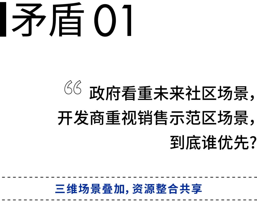 政府强调未来社区场景在城市中的公共性,而业主从市场角度出发认为示范区以及小区出入口优先等级更高。为了让有限的场地条件得到充分利用,化解政府和业主之间的不同诉求,我们突破传统的二维平面排布方式,创造性地提出了“场景叠加”和“空间置换”的总图布局方案。