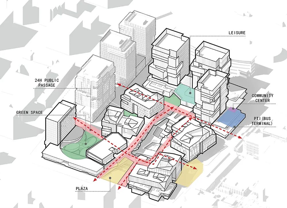 考虑到场地周边环境以及复杂的业态,设计以环形动线在场地中构建了24小时的人行通道,搭配设有绿色植被的中央高架通廊,无缝衔接一期与二期建筑,最大限度实现场地内部的可达性与连通性,使其成为有机的整体,同时连接周边区域,为地块内外的业态功能和配套设施提供便利。“我们将较高的办公塔楼设置在北部,可以俯瞰低层建筑群,每个建筑群都设有内部庭院,与中央人行通道相连。”Aedas全球设计董事祈礼庭(David Clayton)说道。