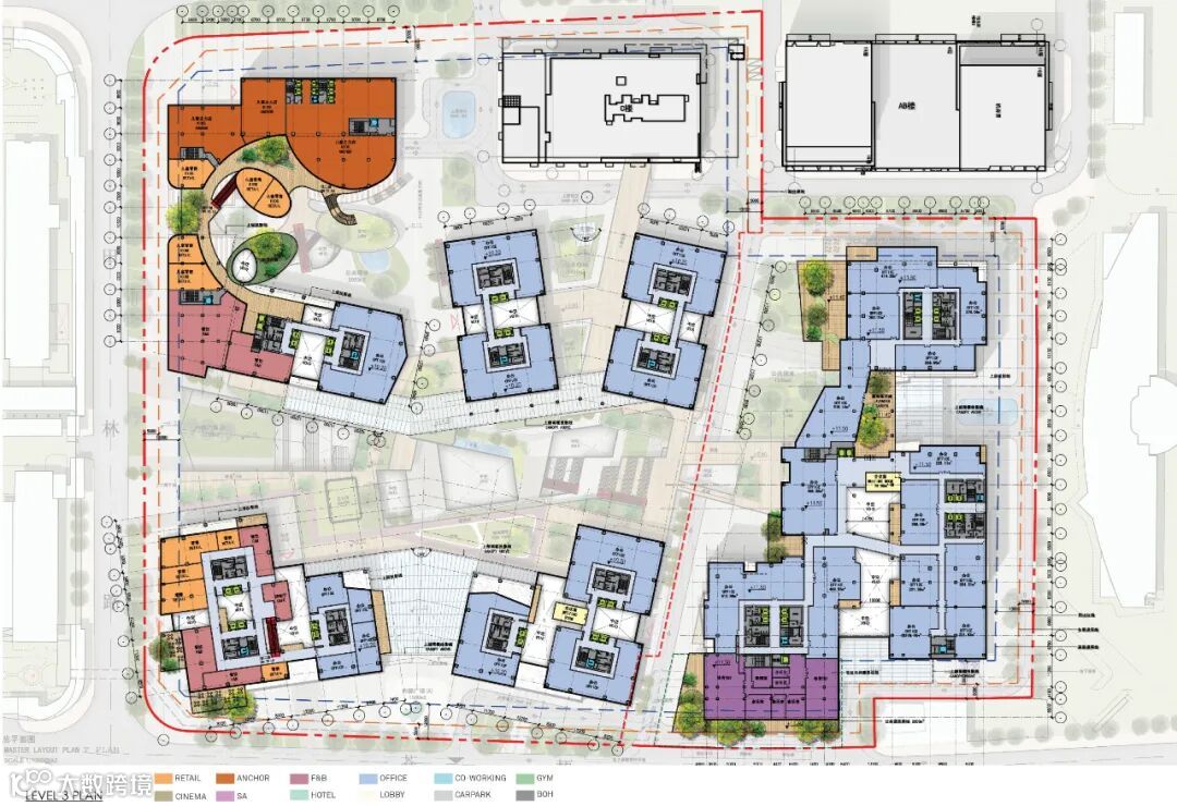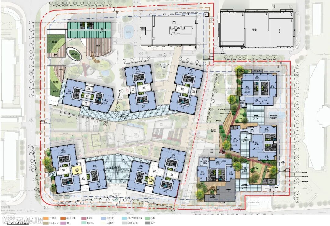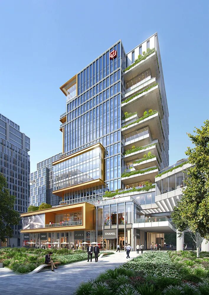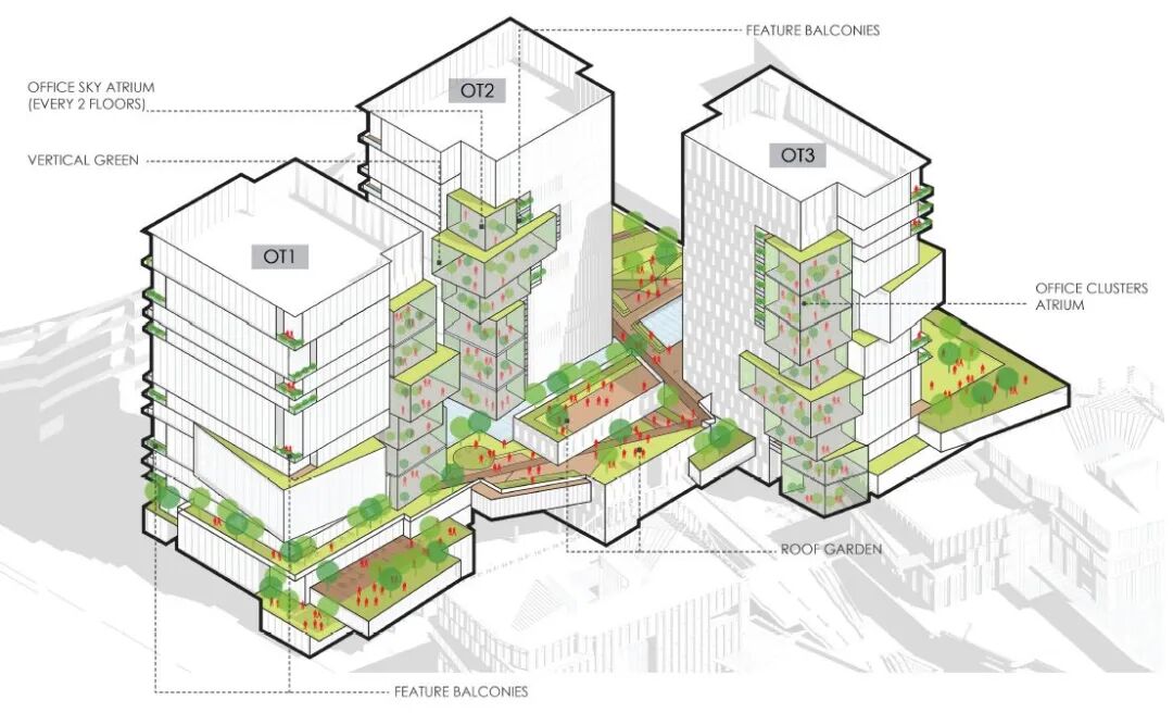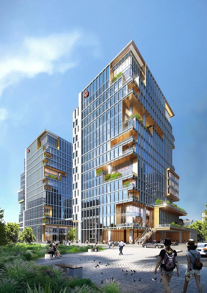 项目共计两期,其中一期包含三座高72米的办公塔楼,二期为五座低层办公塔楼以及配套的零售及酒店业态。
