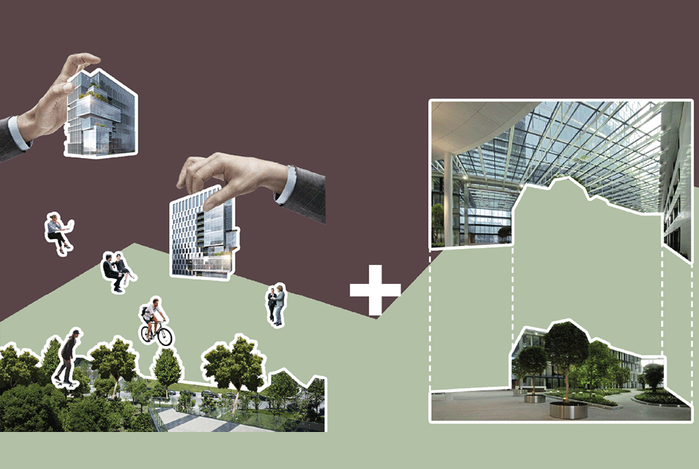 Inspired by the origami cut-and-fold technique, the design uses intersecting lines to shape the landscape and walkways that run through the campus of office buildings. The intersecting points become key spaces for programs, while the central green axis links the interior and exterior spaces visually, enhancing the integrity of the design. The cut and fold design sculpts negative spaces for balconies and stepping terraces that function as social hubs within the office while visitors could explore the many activities scattered through the multilevel walkway.