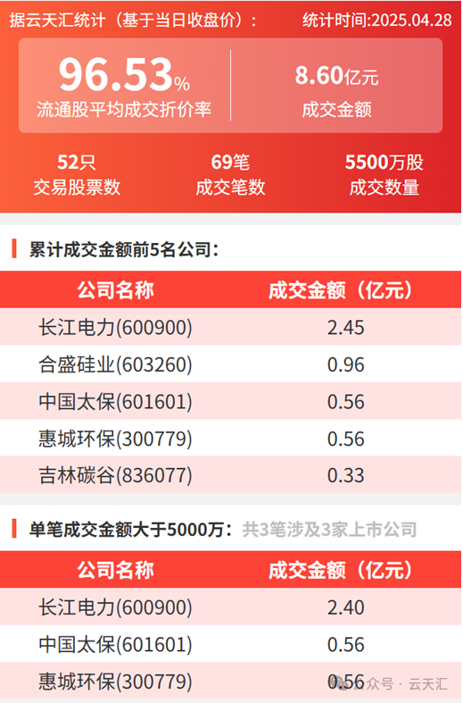 2025年4月28日,大宗交易成交金额8.6亿元,交易股票数52只,成交笔数69笔,流通股平均成交折价率96.53%,成交数量0.55亿股。