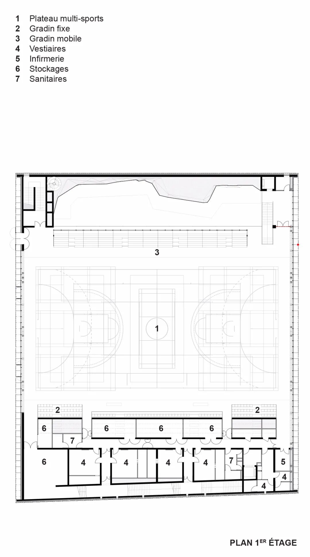 The project is part of a simple plan that completes the framework of a new public square intended to unite the neighborhood. Its facades are kindly aligned with those of the neighboring streets to underline the shape of this vast collective space which combines an ample mineral mall with intimate gardens. The building draws its genesis from the archetypal morphology of the brick warehouses that populated the neighboring docks. This urban landscape, crenelated with double-pitched roofs, is undeniably linked to the heritage of Le Havre to the point of making it a familiar vector of well-being. The project reproduces their profile to perpetuate their almost melancholy symbol, that of a flourishing and peaceful era. It also pays homage to the simple beauty of their capable large volumes by attributing their efficiency to sports spaces.