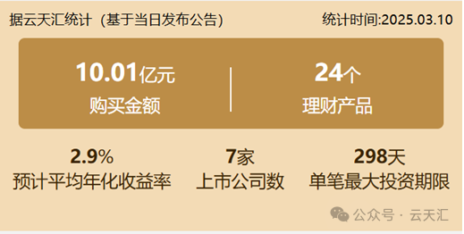 2025年3月10日,上市公司购买理财金额10.01亿元,共7家上市公司,理财产品24个。