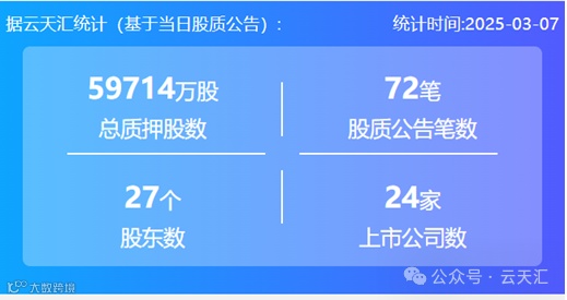 2025年3月7日,股票质押总质押股数5.97亿股,上市公司24家,股质公告笔数72笔,股东数27个。