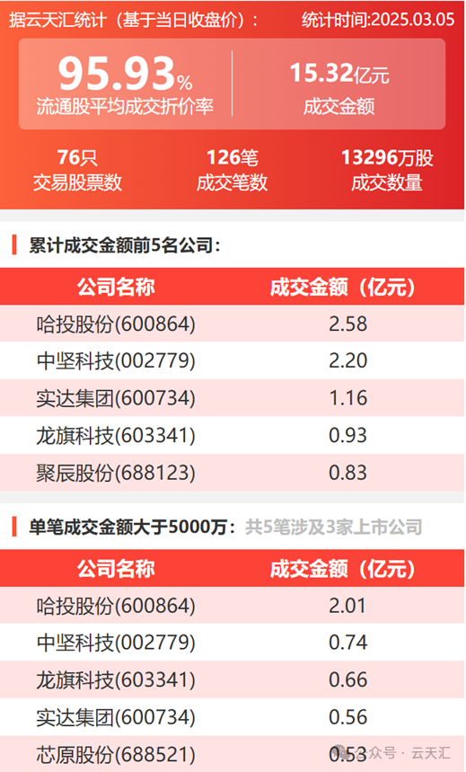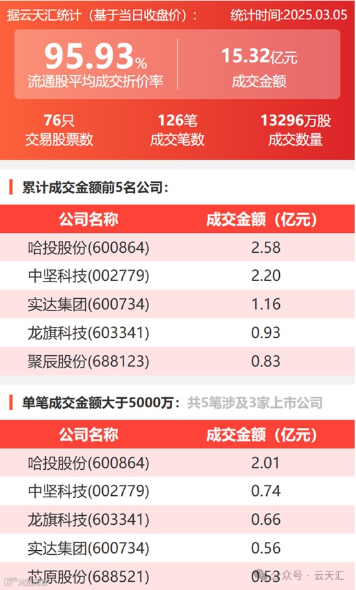 2025年3月5日,大宗交易成交金额15.32亿元,交易股票数76只,成交笔数126笔,流通股平均成交折价率95.93%,成交数量1.33亿股。