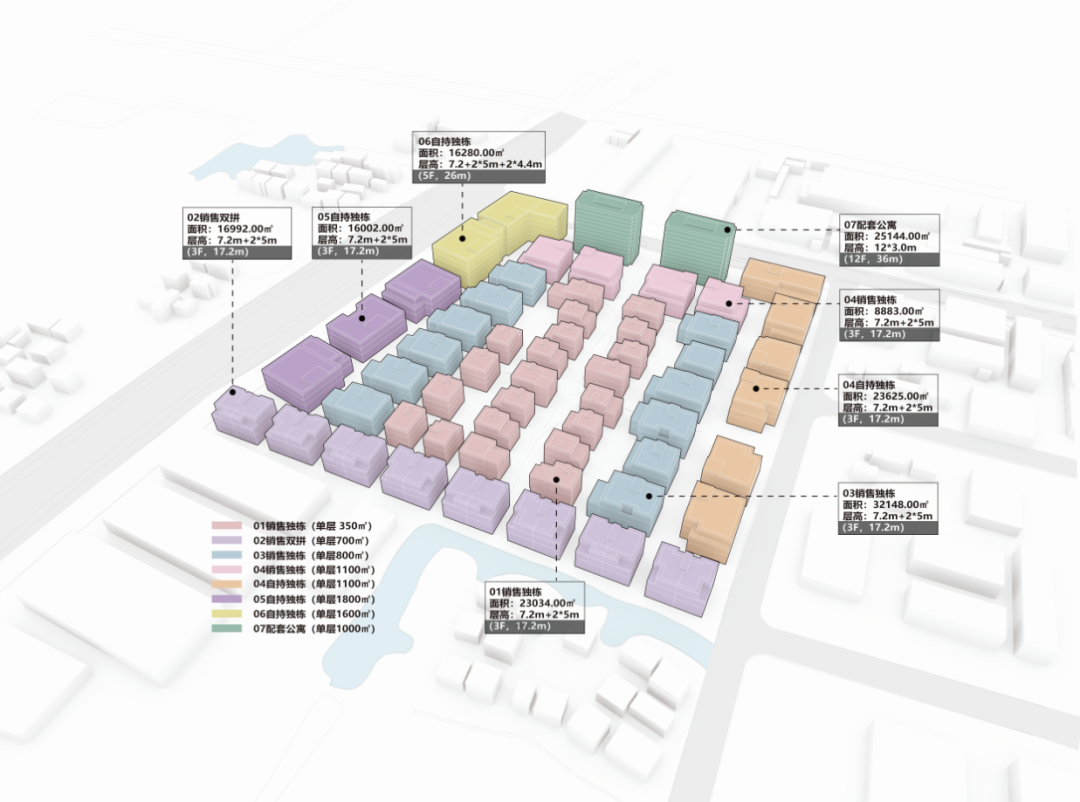根据功能分区及用地价值生成外围马蹄形布局体块,将自持部分的大面积独栋办公及公寓依次落位。为了创造更好的物流环境及方便到达,置入内部交通,同时方便与销售进行分区。将销售部分三种体量的独栋办公,有序的置入在销售区范围内。
