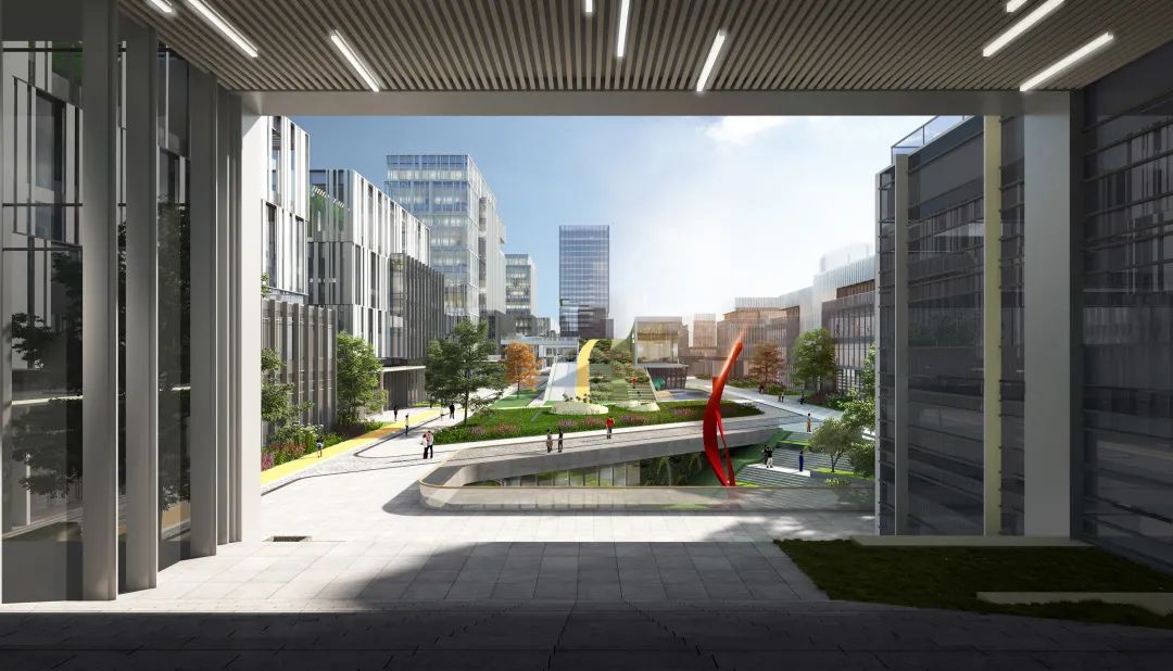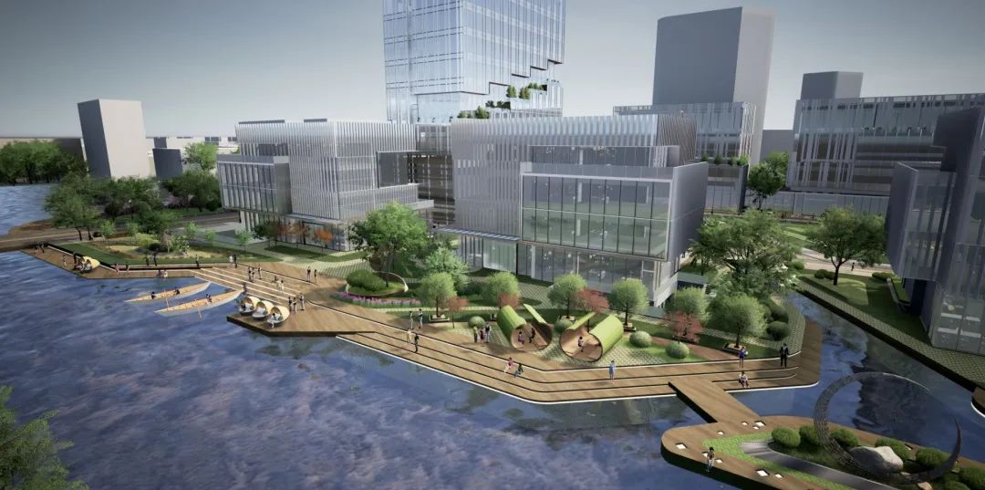 项目旨在打造一个可持续发展、达到技术产出、交流以及管理所需适宜环境的高科技产业园区。结合园区原有水系及周边环境,使园区公共空间与外部环境共生共融。