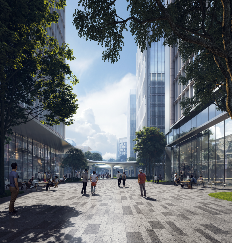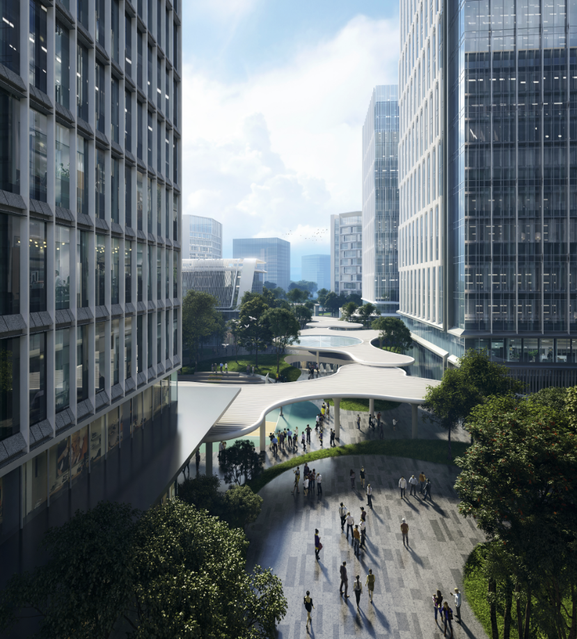 人们可以在景观中轴上进行互动、交流,也可以在每个建筑组团的错落中进行休憩、活动,共同形成一个互联网+科技的高品质园区,真正以互联绿谷造就科技城市,打造新产业空间以及创新体验科技的新时代。