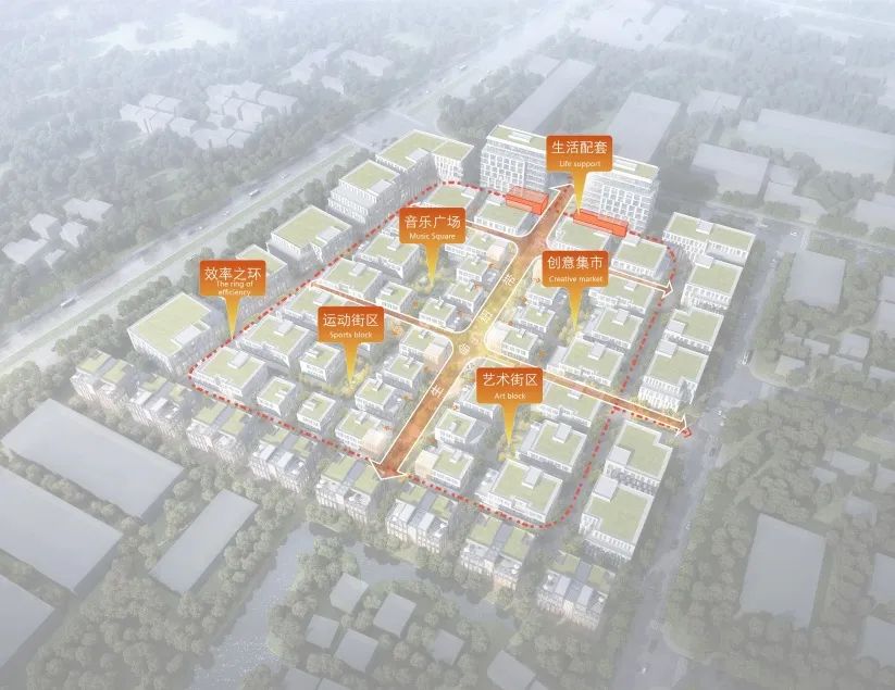 其实,混合的功能设计实际上有可能带来意想不到的运营销售思路。本项目设计之初是希望形成一个内部功能完善、宜商宜业宜居的产业园区。但在招商运营阶段发现这种功能组织非常适合网红孵化产业的需求,未来整体引入产业客户,可能一次性销售50%地块。