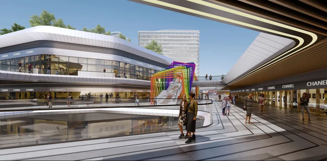 桥的底部对外以配套商业为主,对内部则设置了大量镂空的“趣味空间”,一方面给园区创造更多共享交流场所,另一方面作为缓冲地带,使商业以一种更有趣的形式融入园区的整体环境中。