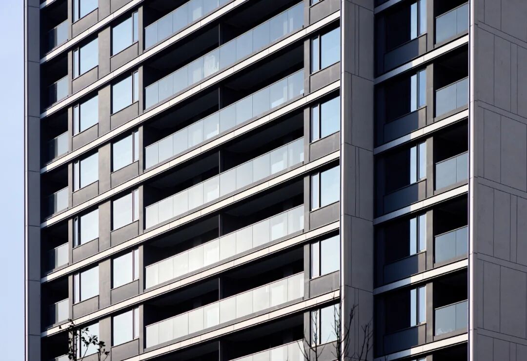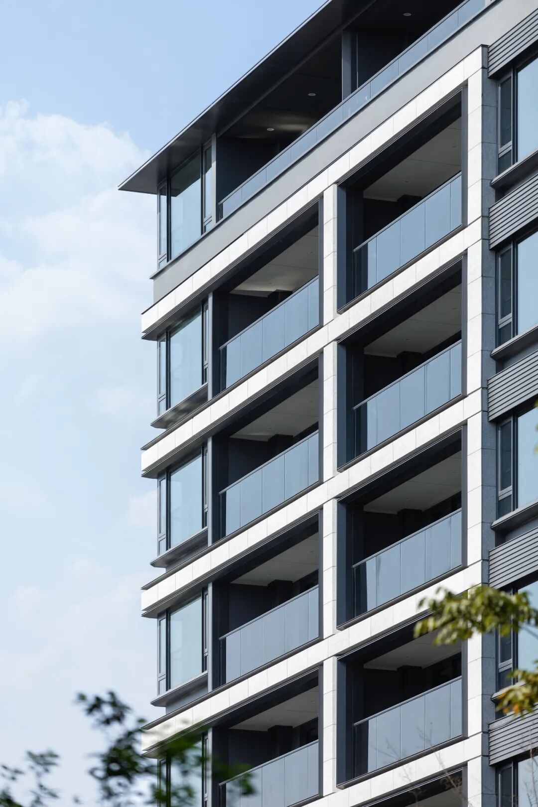 出于立面整体性的考虑,常规做法通常会首选玻璃或百叶等材料对飘窗基座进行遮挡美化。但是我们选择摒弃多余构件,将飘窗自身的构造特点在立面上自然呈现,并在飘窗板端部以精致线条收口,内凹部分应用铝板同色涂料。最终所呈现的效果,自然镂空的飘窗在立面上形成了第二道层次,而转角飘窗的开口设计也更凸显轻盈灵动的形体感。