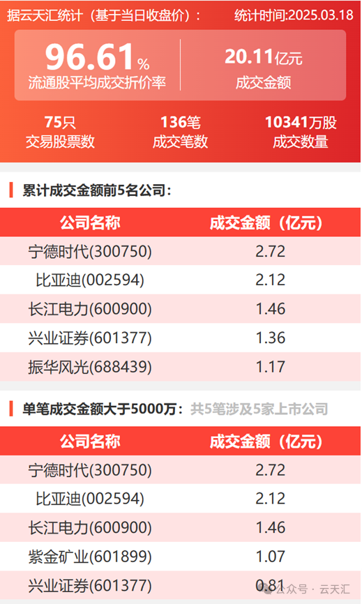 2025年3月18日,大宗交易成交金额20.11亿元,交易股票数75只,成交笔数136笔,流通股平均成交折价率96.61%,成交数量1.03亿股。